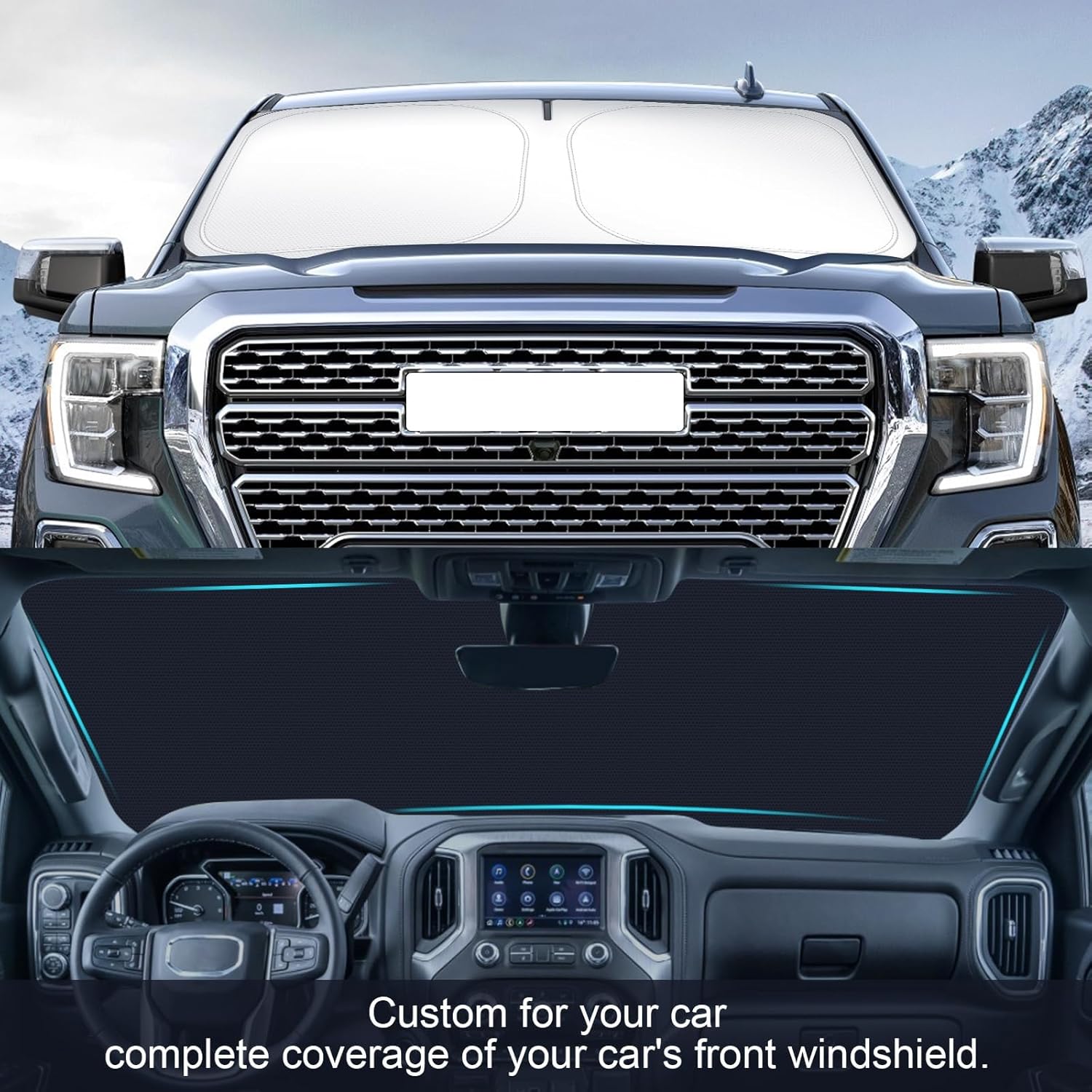 🚗【Easy Installation】For chevy silverado gmc sierra windshield sunshade gmc denali accessories can be easily fixed in your truck without any tools. Unfold the sun shade for gmc sierra accessories, place it in front of the windshield inside the truck, and fix it with the sun visor.