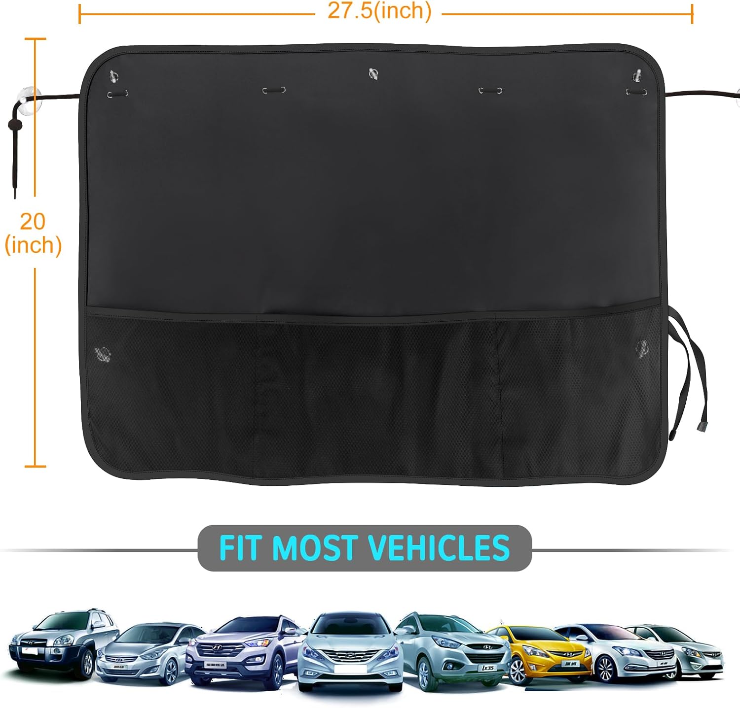 Net Storage Pockets Designed for Convenience: Our car sun shade is designed with 3 net pockets, which can store small and light items such as tissue, towels, lipstick and other cosmetics, handheld fan,etc. Make it easier for you and your family to travel. PLEASE NOTE the pockets hold heavy items may cause the suction cup to fall off.