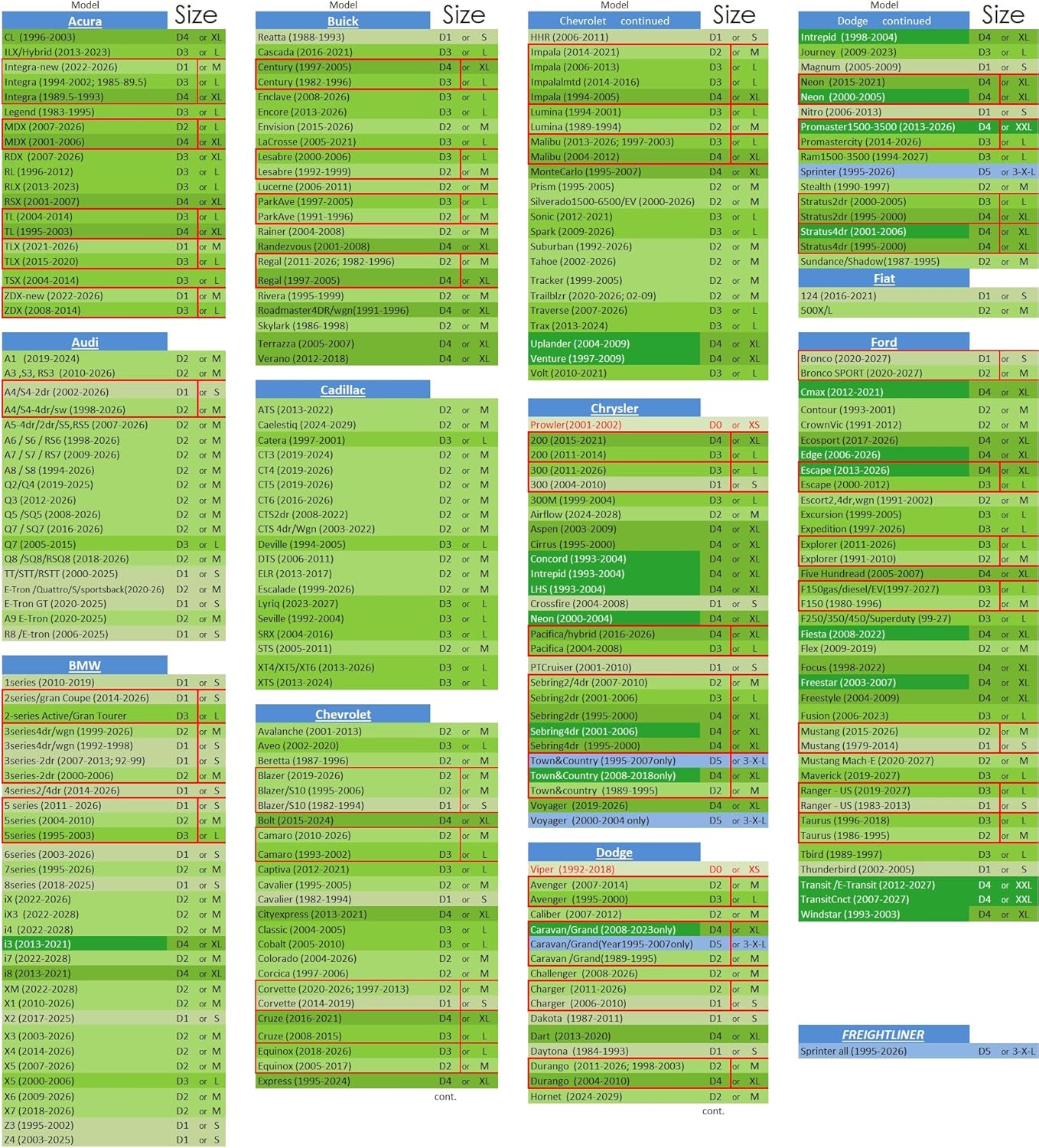 Easy to read Size compatibility chart