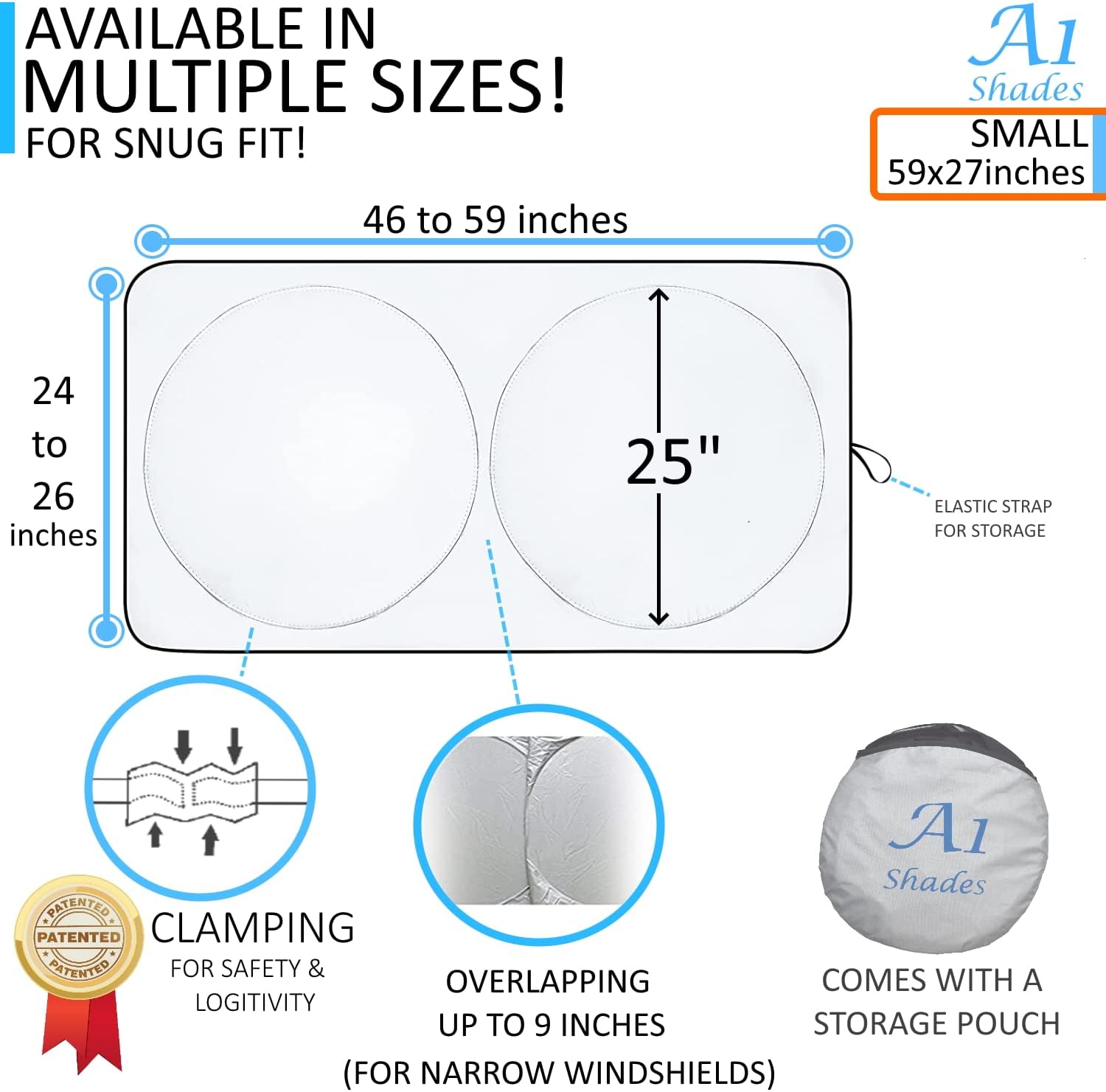 Car Sun Shade with Storage Pouch by A1 Sunshades Shield Protector Blocker Retractable Cover Sunscreen Auto Interior Accessories Visor Small
