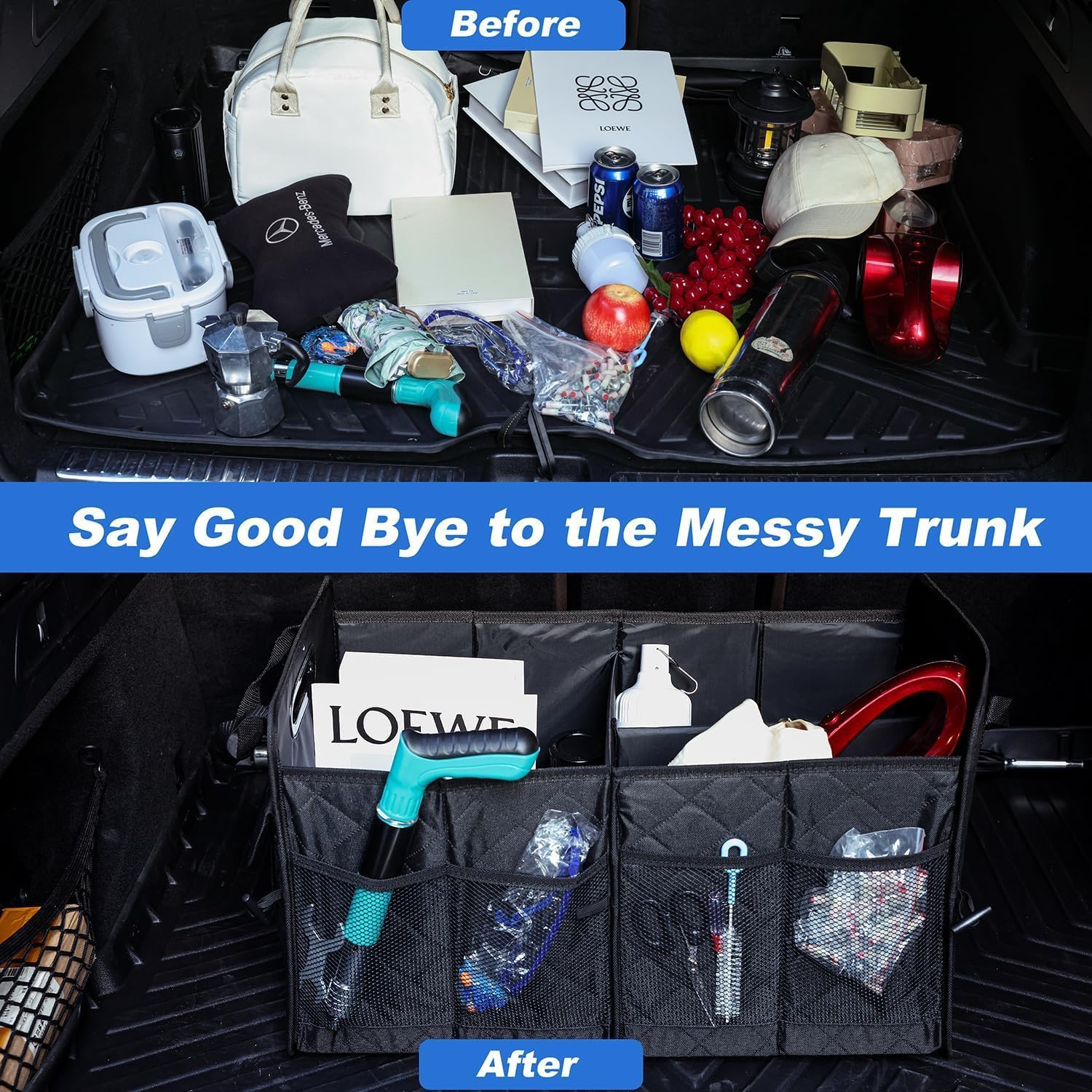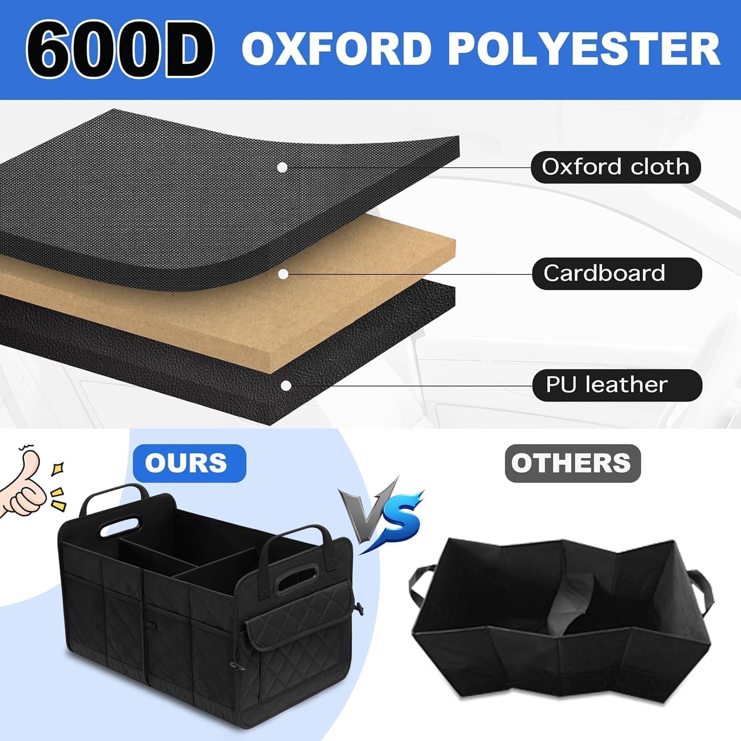 Car trunk organizer material: The organizer for car is made of 600D Oxford cloth material, which is more wear-resistant and feels more comfortable, wear and easy to clean. The partition board is thick and does not easily deform. Have higher stability and load capacity.