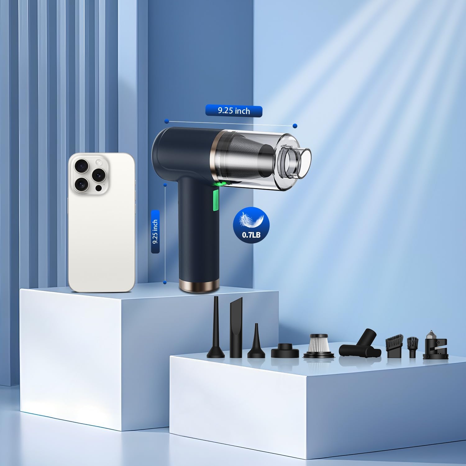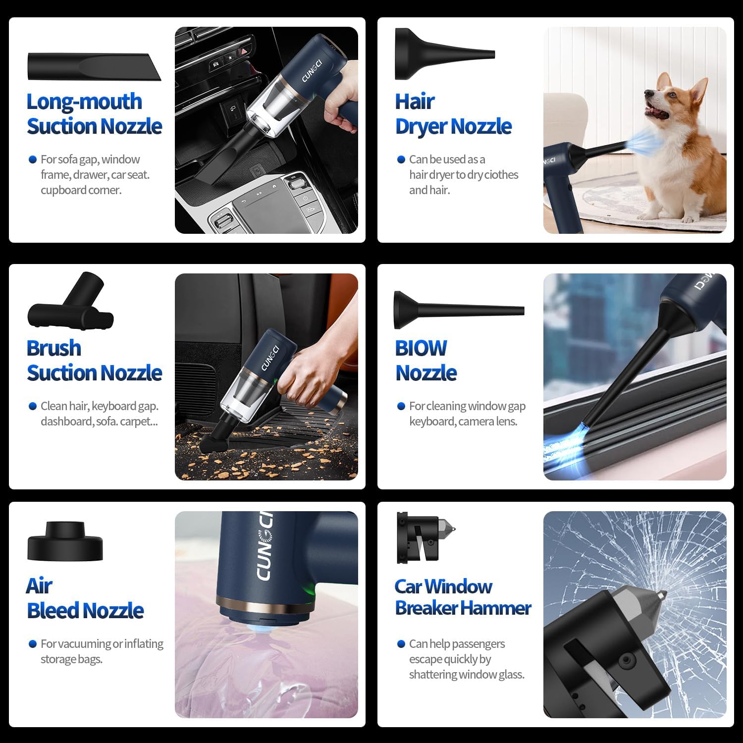 5 in 1 CAR VACUUM CLEANER: Handheld Vacuum Cleaner used with 9 accessories, you can get 5 modes of suction, blowing, inflating, window breaker hammer and vacuum compression to meet your different use scenarios. The blowing nozzle can be used to blow away dust from keyboards and narrow crevices. The floor and nozzle brushes can easily suck away all kinds of debris. Two sizes of universal nozzles can quickly inflate or deflate objects such as swimming rings and mattresses.