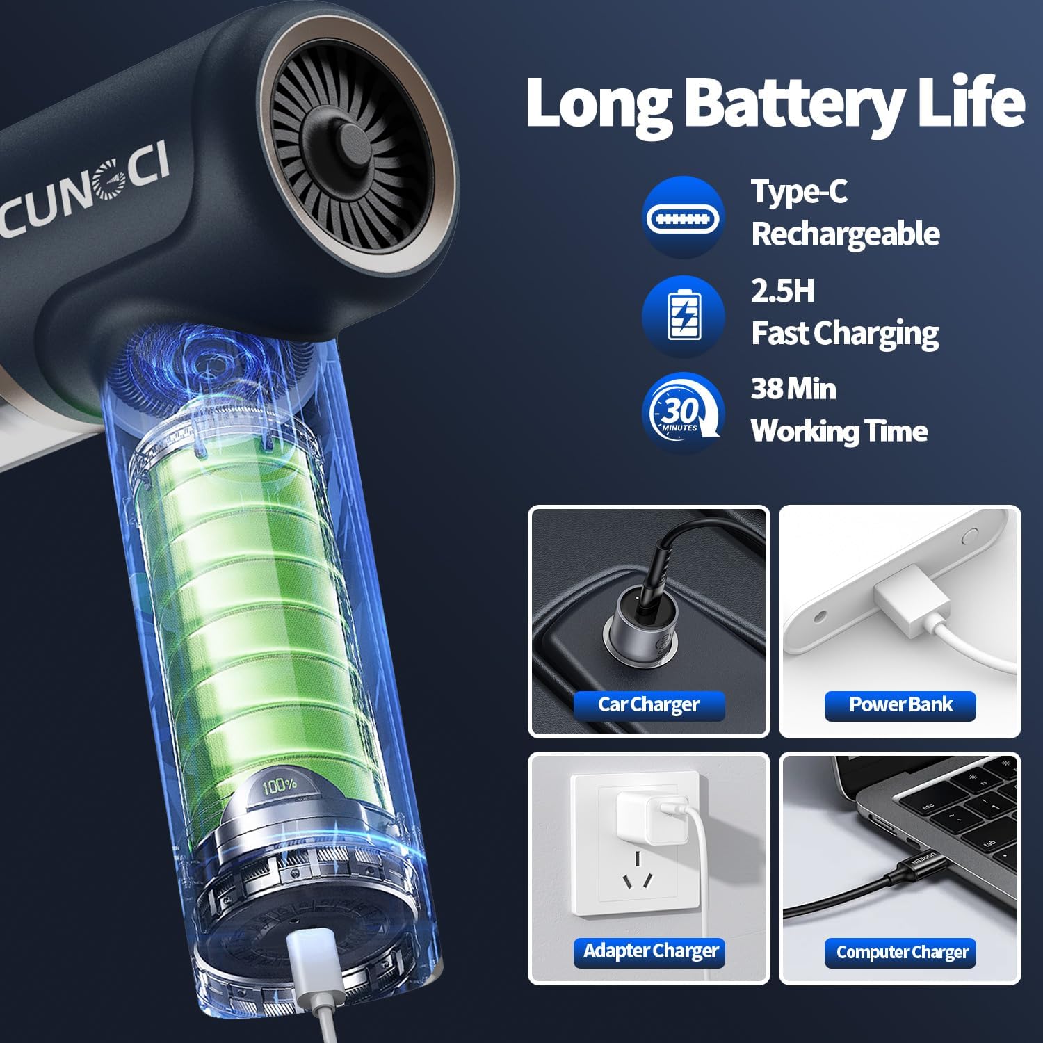 4000MAH HIGH CAPACITY AND 3-HOUR FAST CHARGE: This car vacuum cleaner is powered by a 4000 mAh battery and supports Type C charging. It can be fully charged in 2.5-3 hours, and can be used for nearly 38 minutes in eco mode and 18 minutes in super suction mode. Equipped with TYPE-C charging cable, you can use car charger, mobile power, laptop, rechargeable treasure and other ways to charge easily.