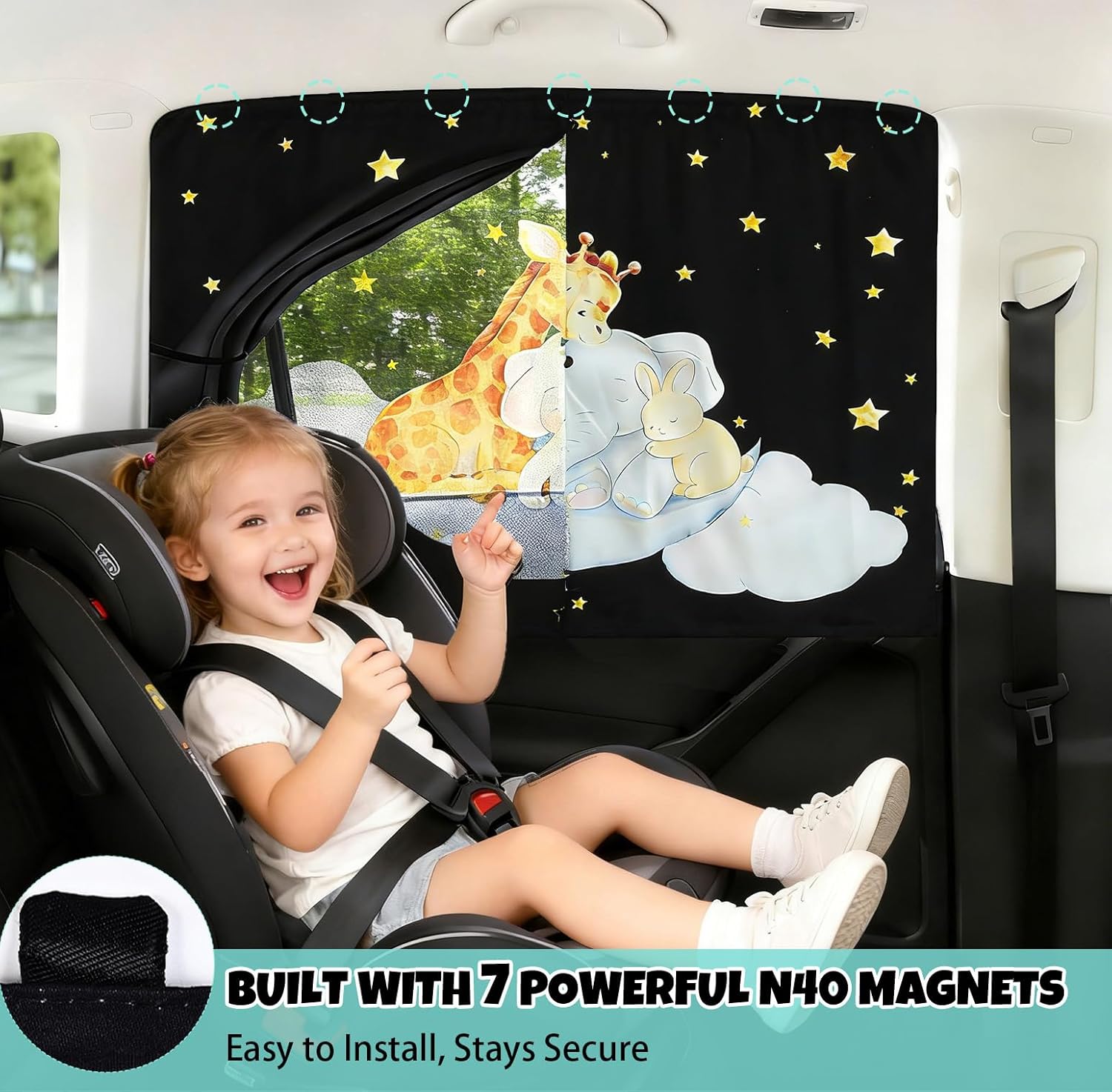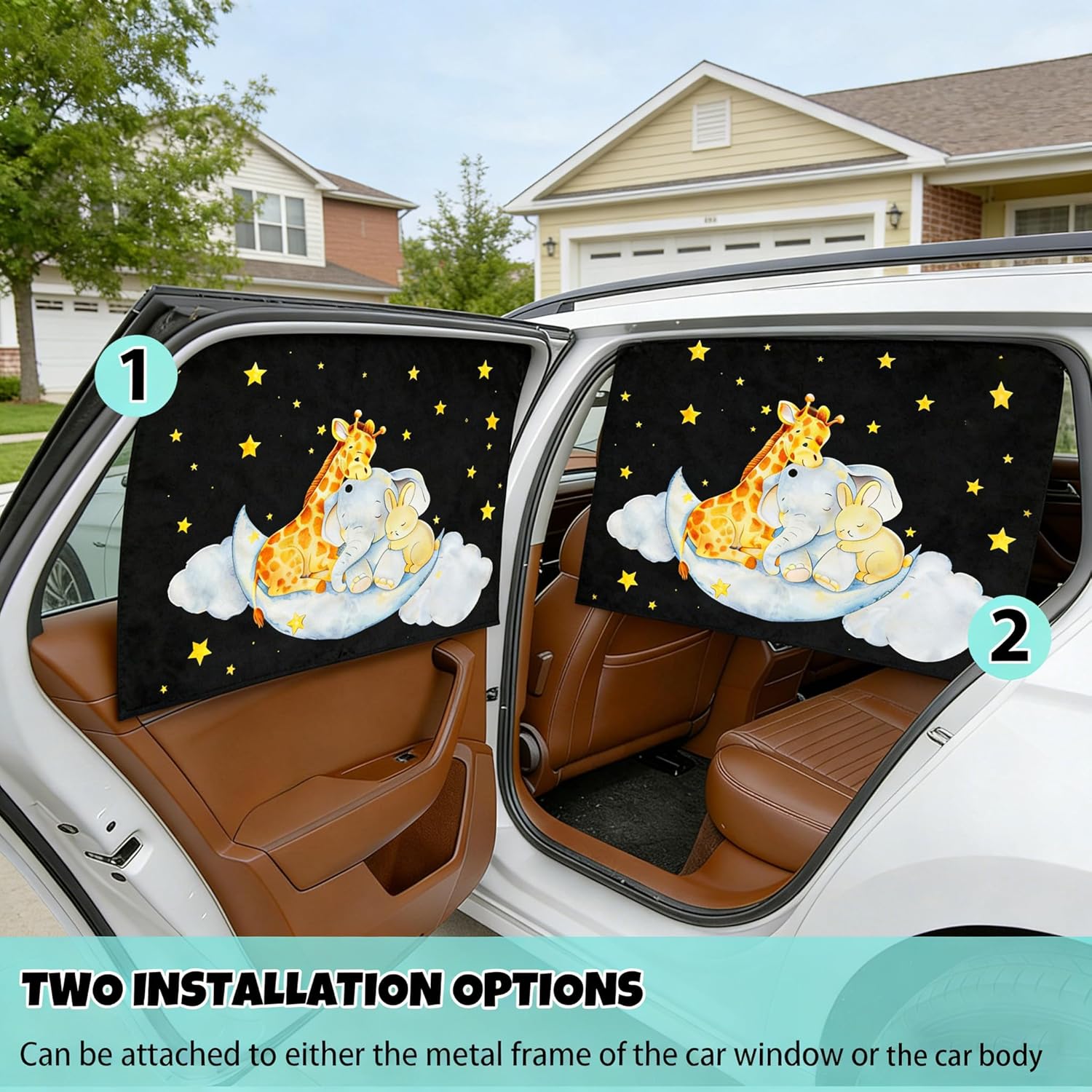 Cartoon Car Window Shade for Baby & Toddler: Featuring a soothing night sky design with a cute giraffe, elephant and bunny, this car window shade creates a calm and cozy atmosphere for little ones, helping reduce fussiness and support restful naps on the road. The double-layer design allows you to tie back the full shade fabric when needed, leaving the breathable mesh to block sunlight and UV rays while maintaining a clear outside view.