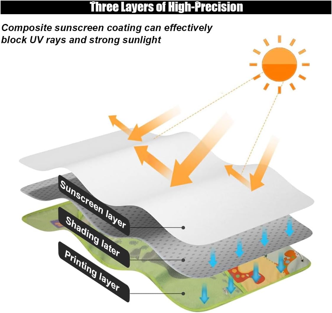 【UV Protection】:This car sunshade is made of 3-layer composite fabric, which can block 99% of sun glare and UV rays, protect your children from harmful UV rays, and keep the temperature inside the car cool and comfortable.