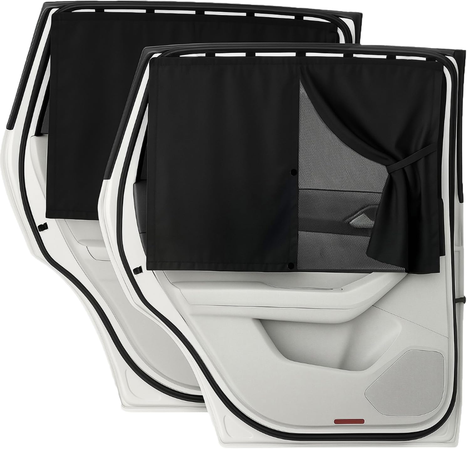 Double-Layer Fabric for 99% Sun & UV Block: For REAR side windows ONLY! Our car window shades designed with two layers—one translucent mesh and one opaque blackout cloth. You can switch between full shading or partial shading modes as for privacy or visibility. This car sun shade effectively blocks 99% of sunlight, heat, and harmful UV rays, ensuring a cool and comfortable ride for you and your family.
