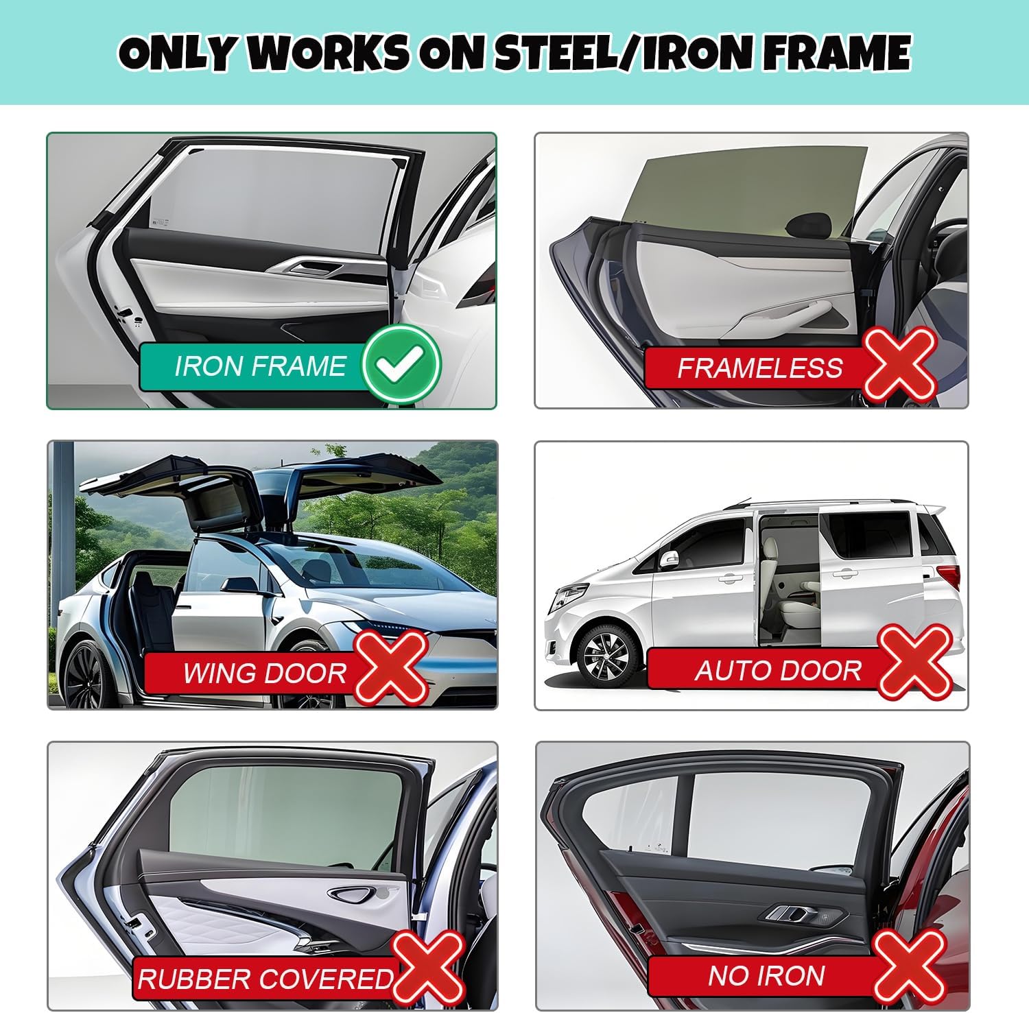 Magnetic Design with 7 Strong Magnets: Our car window shade for baby features 7 upgraded magnets at the top for a secure fit on steel frames. The powerful magnets ensure stability and prevent it from falling off easily. Please check your window frame before purchasing, as magnets may not work well with plastic or rubber frames. Not for frameless windows like Tesla’s.