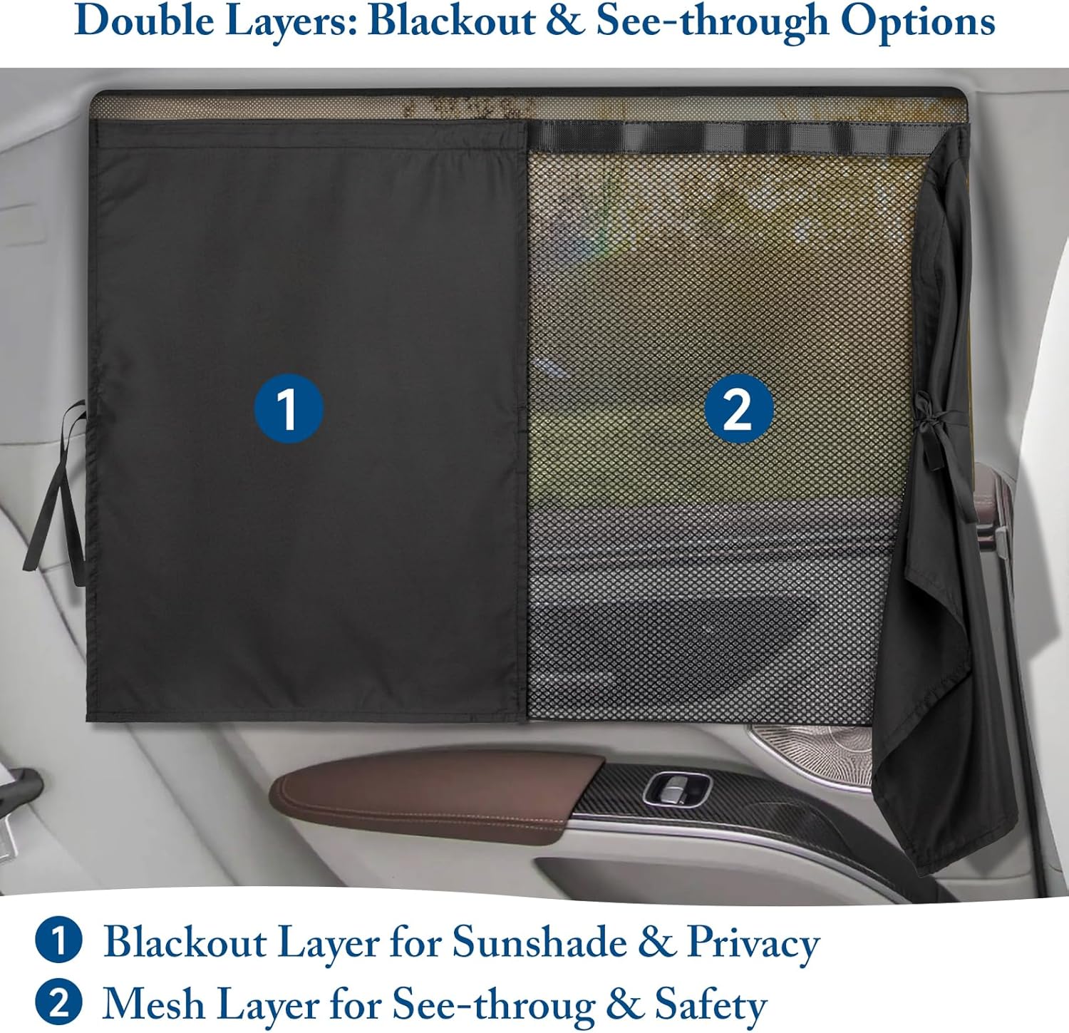 🌞 Back(Rear) Window Sun Shades: Double layers design combines see-through mesh (for UV protection + driving visibility) and 100% blackout fabric (for total darkness). Use both layers for maximum shade, or detach the blackout layer via Velcro to keep only the mesh for safe shaded driving. Please DO NOT use it for front windows to block the driver’s sight.