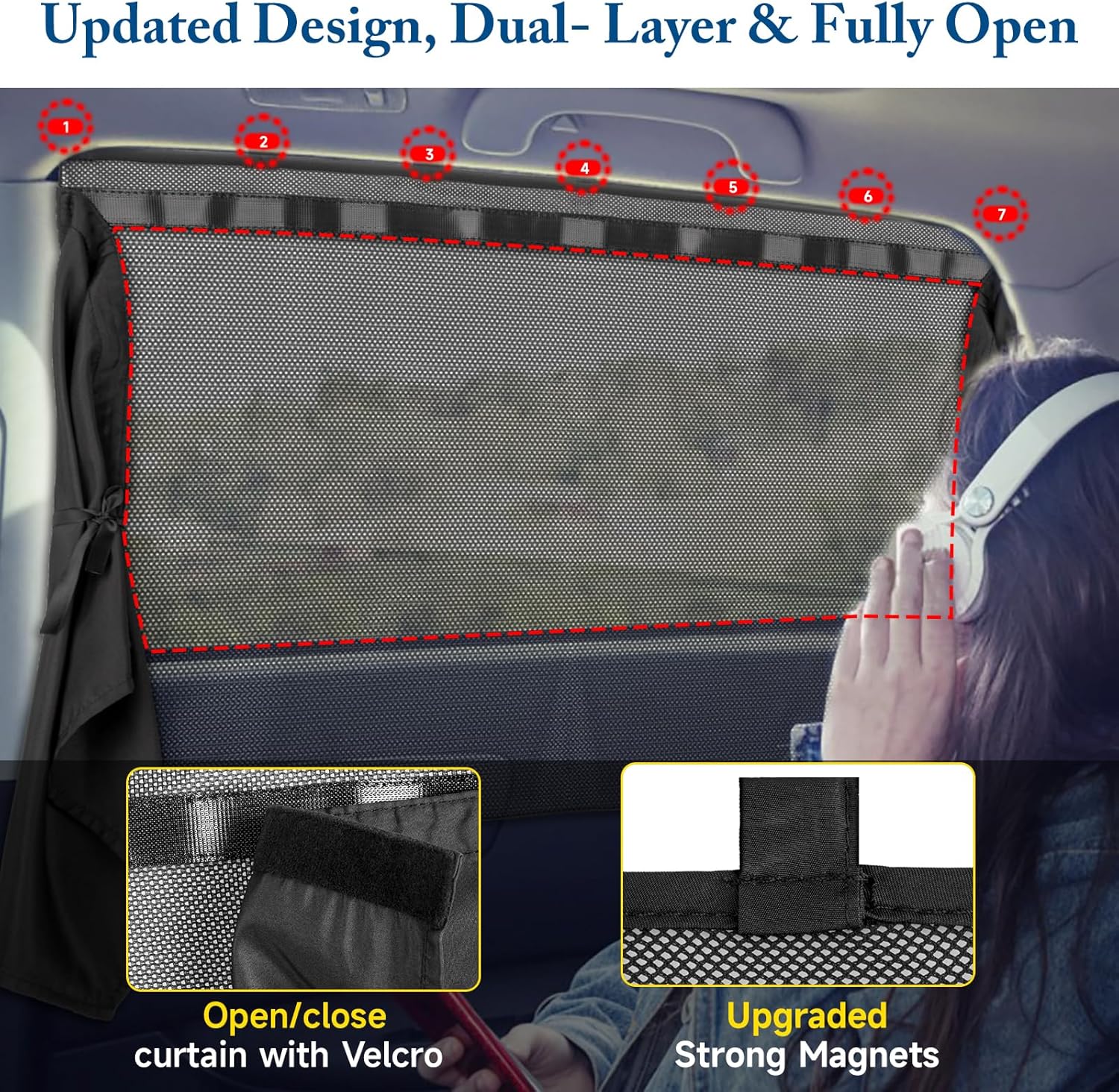 Car Window Shades, [2025 Updated] 2 Pack Car Sun Shade for Baby, Double Layer & Fully Open, Magnetic Back Window Curtain, Sun Shade Covers Privacy Screen