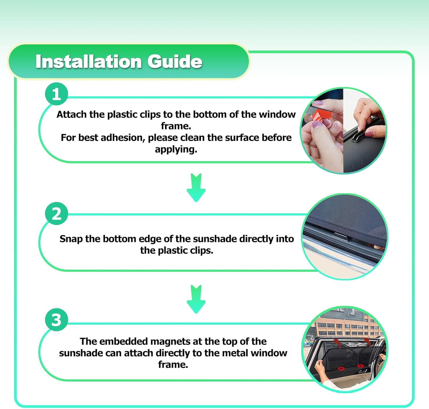 Easy-to-install Magnetic Car Window Screens: Strong built-in magnets snap onto the door frame in seconds. For non-metal surfaces, adhesive buckles are included for secure support. No tools needed—easy on, easy off