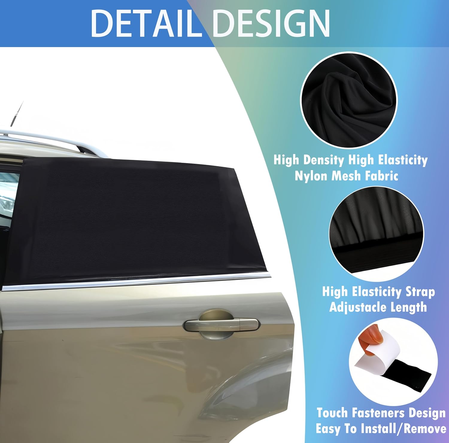 ►【PROTECT YOUR KIDS FROM SUN AND HEAT】: Beicarin car side window shade for baby is made of high quality breathable and stretchy spandex mesh. Protect your baby kids and pets from UV rays and sun glare. No sunburn and also have a rest in car without mosquitoes disturb.※Used for REAR window, NOT for front window※