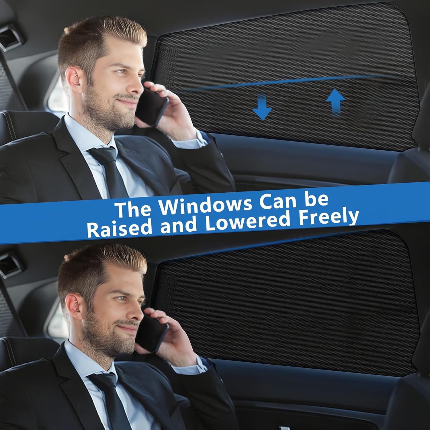 ►【FREELY RAISE & ROLL DOWN WINDOWS AND PRIVACY ROOM】: The car rear window sun shade mesh is install on the exterior of the door frame, you can freely raise and roll down the windows. It will create a privacy and safety room for the back seat passengers with this breathable and elastic mesh fabric. ※IMPORTANT NOTE: Please observe the road conditions behind the rearview mirrors, because there is a blind spot on the rear window where the cover was installed.※
