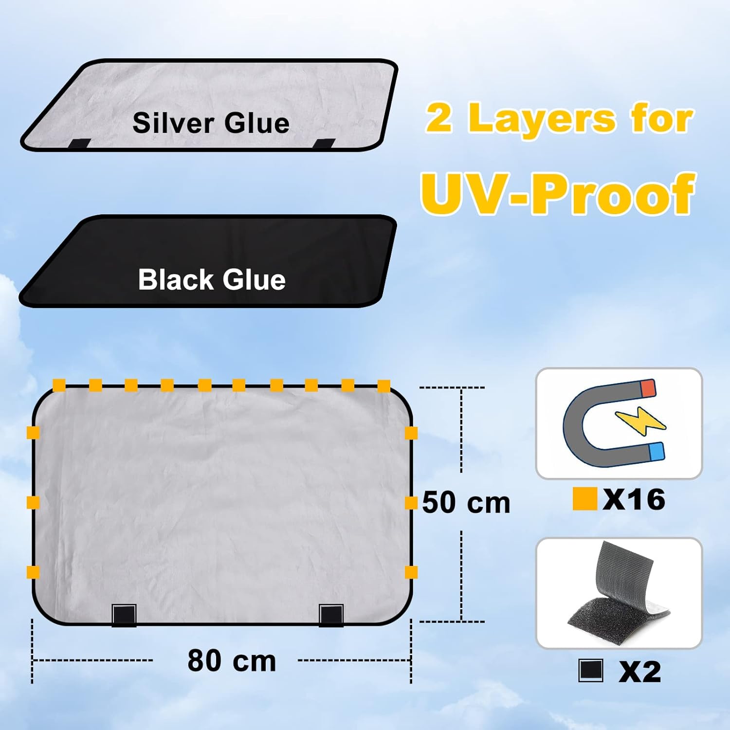 This car sun shade curtain has a size of 80 (L) x 50 (H) cm and fits well with most family cars. At the top there are 10 M40 magnets for attachment, and 2 auxiliary straps at the bottom. You can decide whether you want to use the 2 types of fixed auxiliary devices according to your own needs.