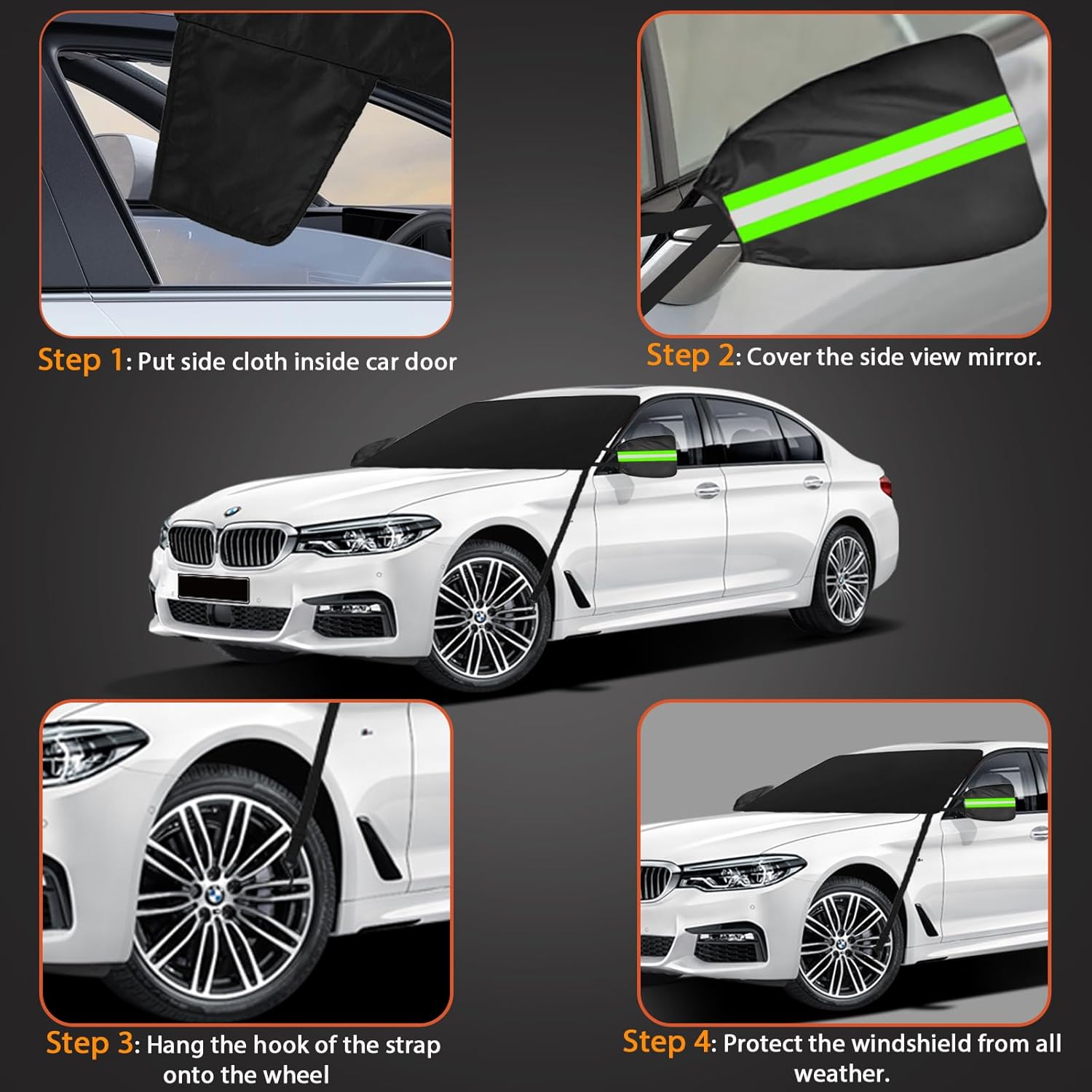 【All weather protection for all four seasons】With this frost guard windshield cover, no more worry about the snow, hail, frost, wind, sunlight, rain, dust, resin, leaves, debris and bird droppings, etc. This car windshield cover will be the tough protector of your outside car not only in winter but also in all seasons!