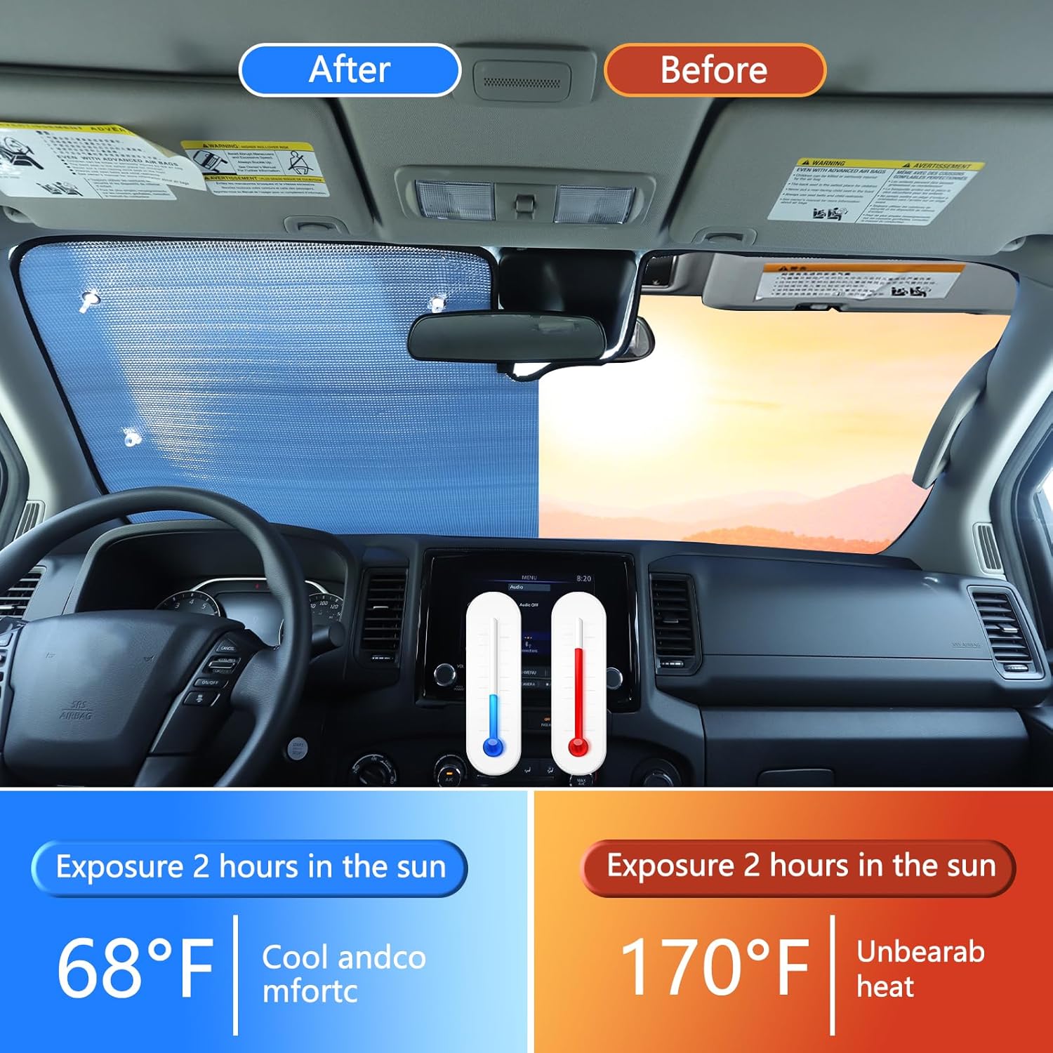 【Provide Protection】:Our windshield sunshade covers the entire front windshield, effectively blocking UV rays and heat from entering the interior of the car, preventing strong UV rays from harming the interior and seats, Reflector Sunshade Offers Ultimate Protection for Car Interior.