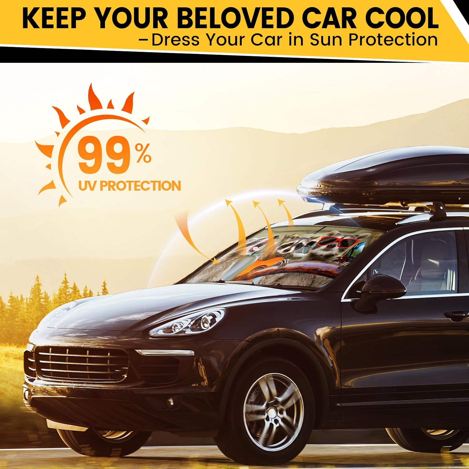 Easy to Install – Installing the sunshade is very simple. Unfold the sunshade and place it at the bottom of the front window, with the pattern side facing outward and the black side facing inward. Use the sunshade to press it down and then fix it above the rearview mirror with magic tape