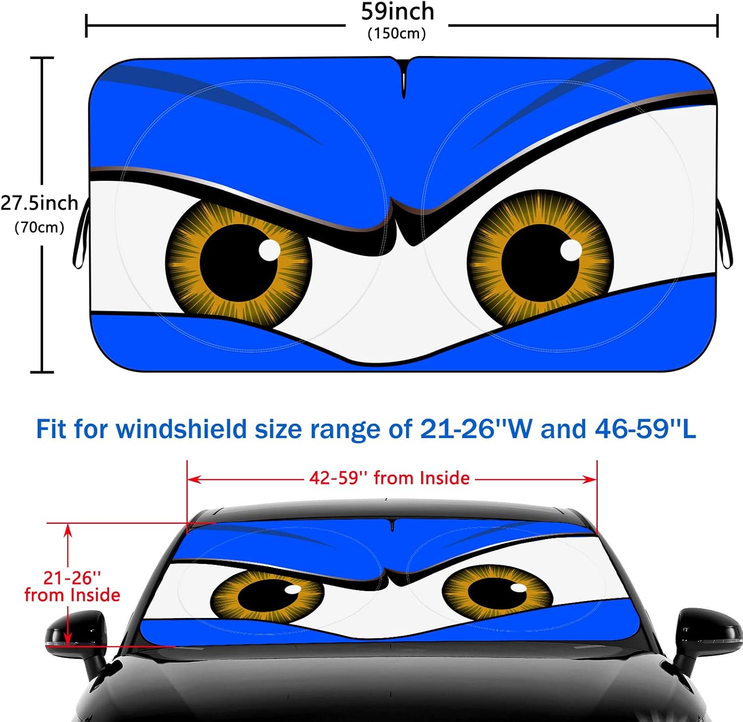 2 Size:There are 2 size that you could choice.Standard size is 59‘’x27.5‘’(LXW),which could fix for car windshield that is no larger than L 59″ x 27″. The larger size is L 63.7″ x 32″ W which could fix for car windshield that is no larger than L 64″ x 30″ W.You can chose the right sunshade size for your vehicle in the size chart