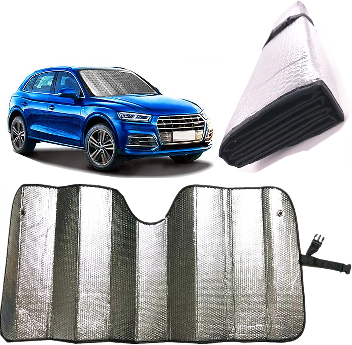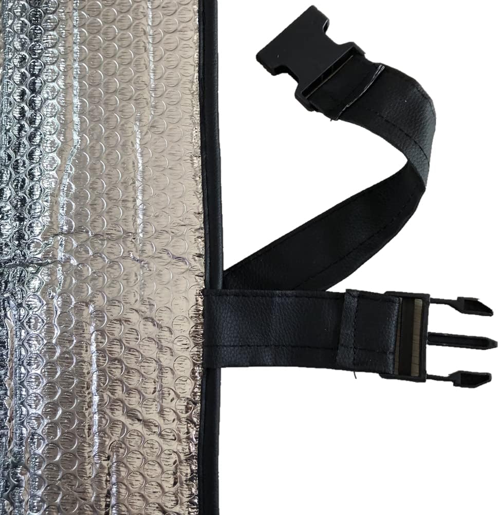 ★ KEEP CAR INTERIOR COOL: Windshield Sunshade- 5-Layer Super Reflective Insulation:1.Aluminum Film Reflective Insulation 2.Honeycomb Bubble Insulation 3. Insulation Layer 4.Honeycomb Bubble Insulation 5.Aluminum Film Reflective Insulation,Reduces Interior Car Temperatures By 30-50 Degrees.Blocks Damaging UV Rays, Keeps Car Cooler On Sunny Days.