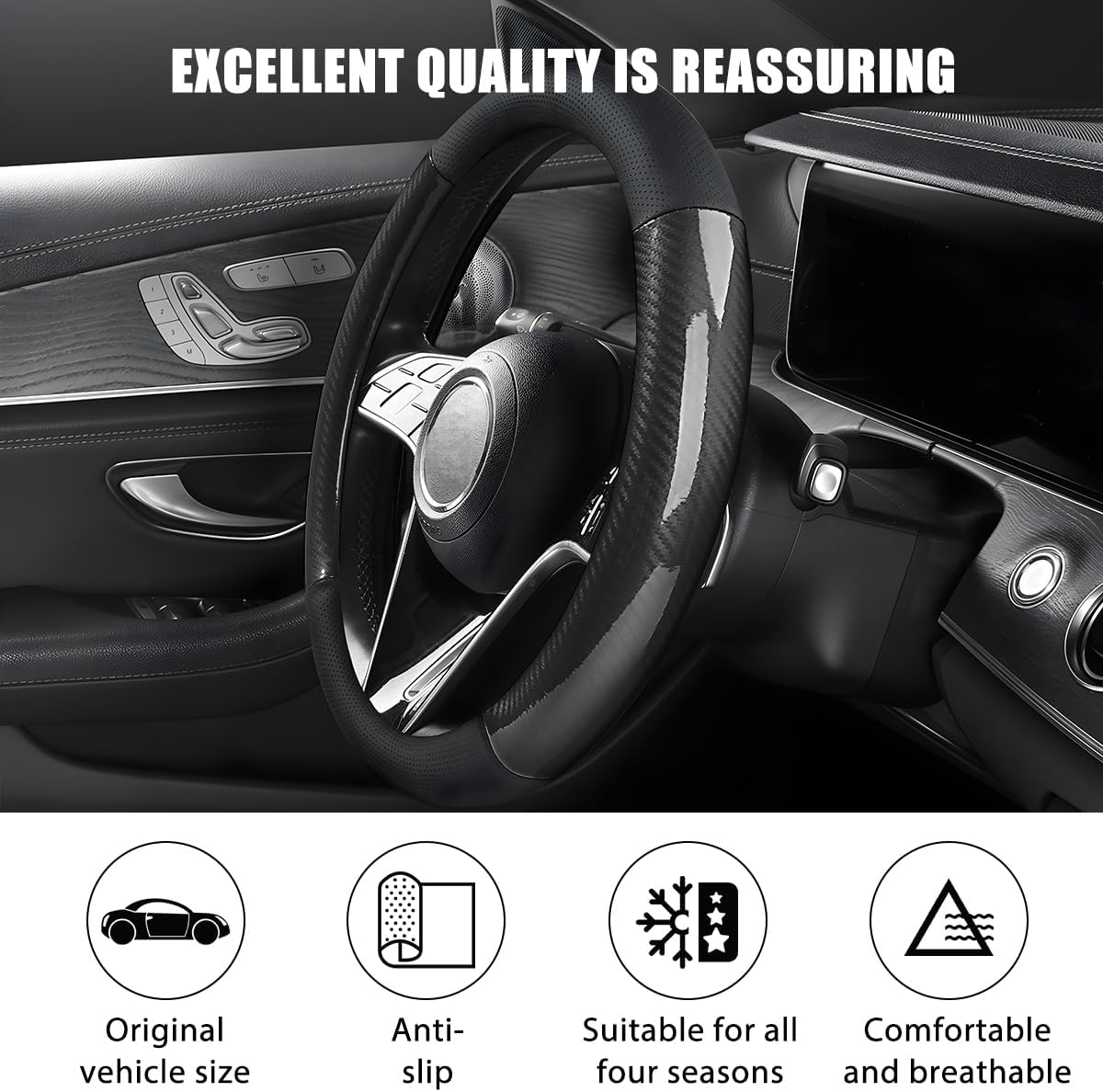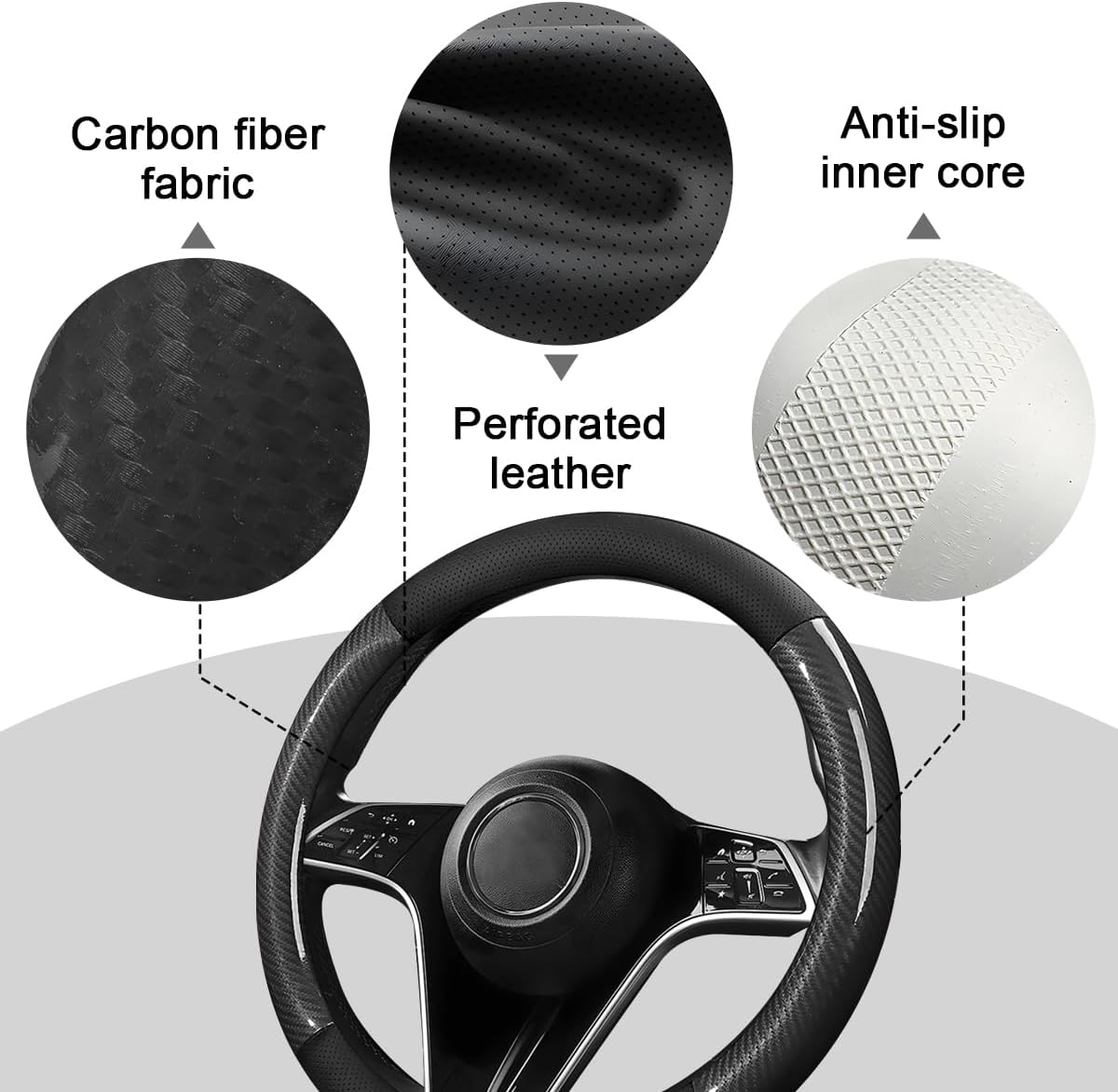 High Quality Material: This car steering wheel cover is crafted from leather and carbon fiber materials. The leather provides a smooth and soft texture, while the carbon fiber enhances durability and resilience. It stays warm in winter and breathable in summer, offering a comfortable grip year-round for a more enjoyable driving experience.