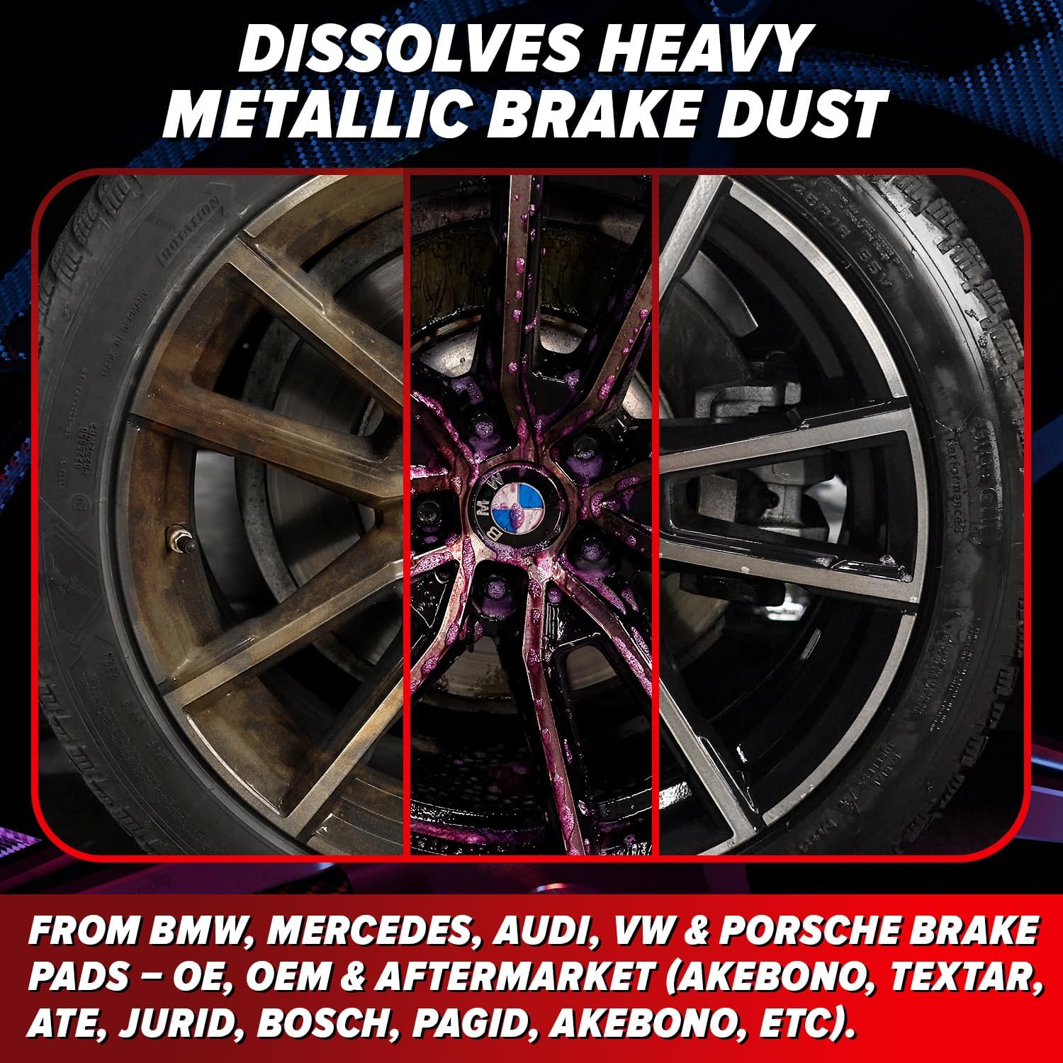 Carfidant Rim Reactor was made for German vehicles with OE and OEM pads from BMW, Mercedes-Benz, Audi, VW & Porsche. These deliver strong braking but create metallic dust. Rim Reactor dissolves it fast without acids, safe for all wheels. Also safe for other vehicles.