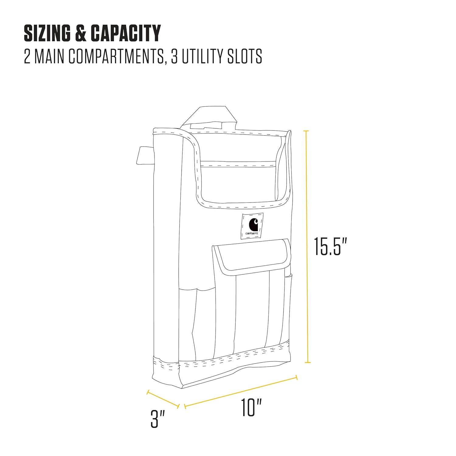 A very handy front seat organizer for work. Made of Carhartt quality with a few slots for papers or laptop and some small exterior areas.This does have some capacity restrictions so if you are look to have a catch all for a large amount of stuff, you probably need to look at other options.