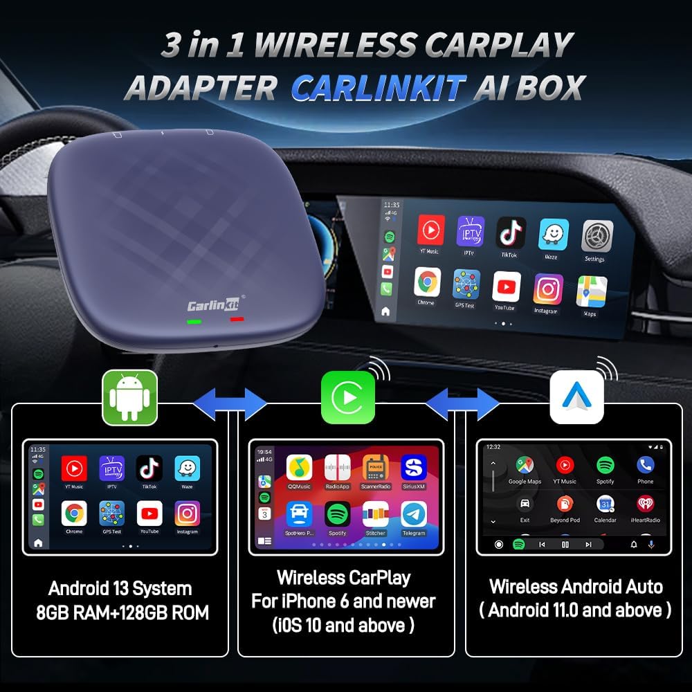 CarlinKit CarPlay Ai Box Magic Box Android 13.0 System Wireless CarPlay Adapter Android Auto Support Netflix YouTube Google GPS+Glonass 4GNetwork.for iPhone & Android Phone,Wired to Wireless,8GB+128GB