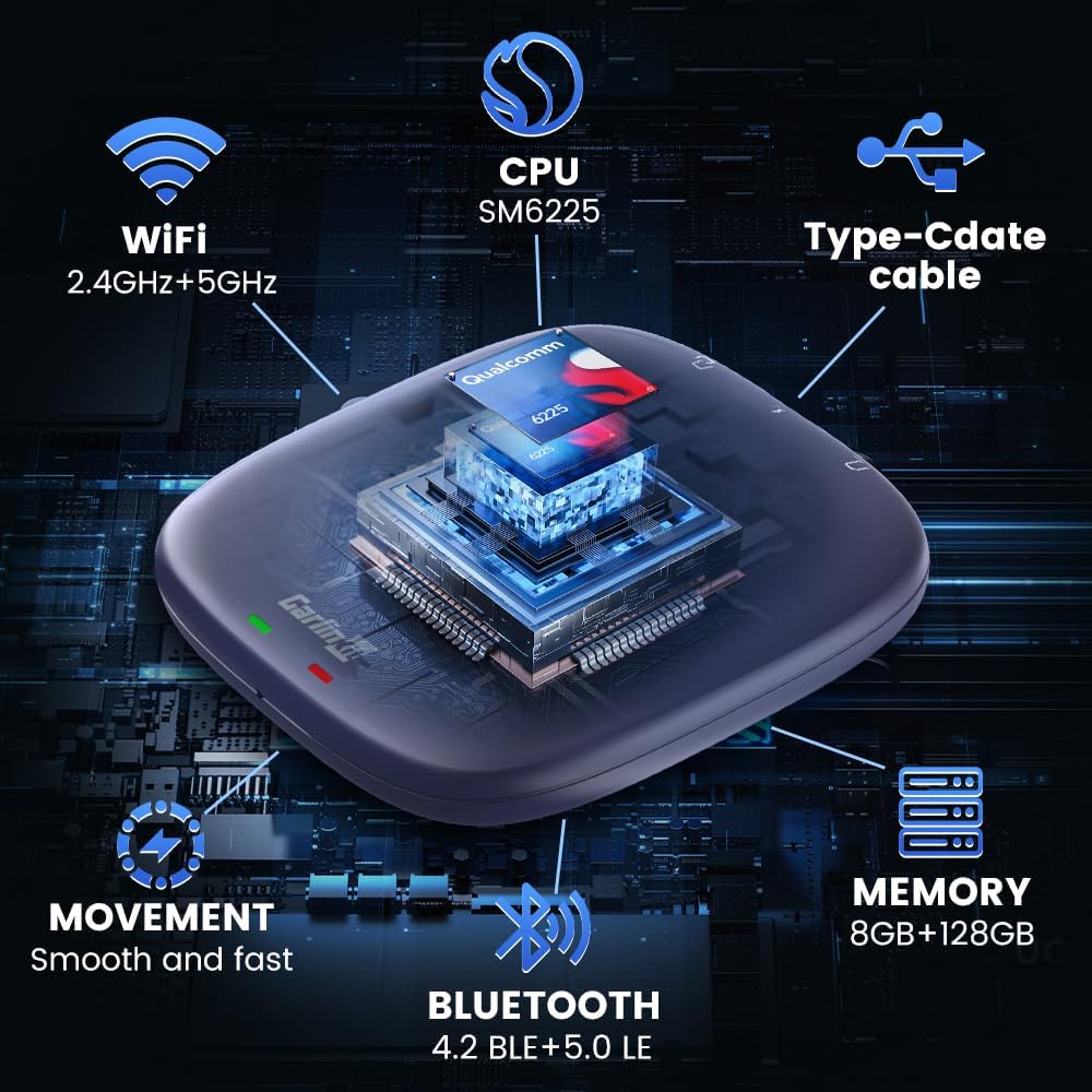 Wireless CarPlay Adapter Adopted Qualcomm chip: with Qualcomm SM6225 2.0 GHz 11nm process technology, smooth and lag-free.