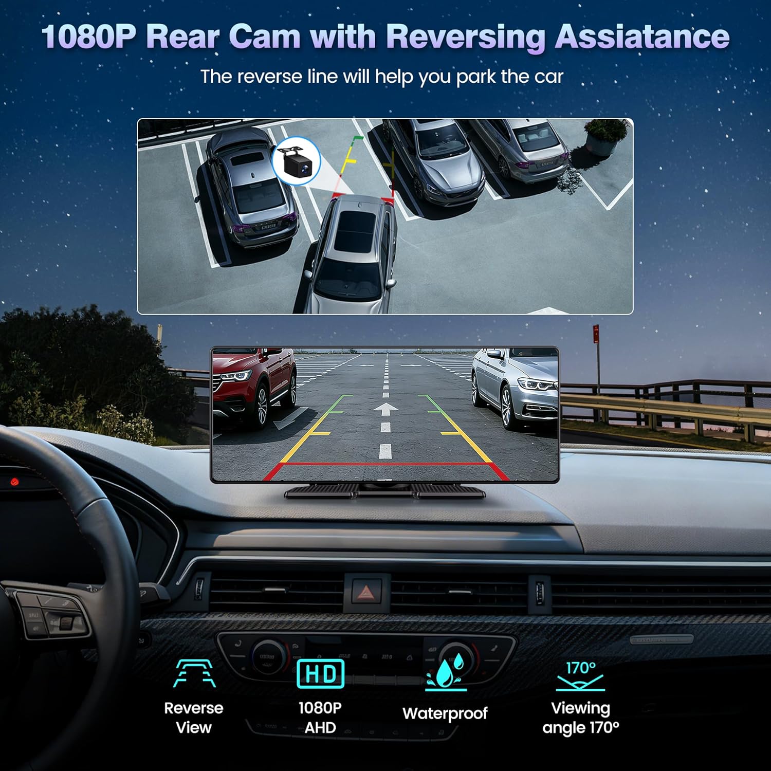 This 9.5 inch car play screen offers many practical functions in one compact unit. I have been using it for 4 days in my daily driving, and it connects smoothly with both Apple and Android phones. The wireless CarPlay and Android Auto connection through Bluetooth is quick, and voice control with Siri or Google Assistant works well for calls, music, and navigation. The screen is bright with clear colors, and the 1600 by 600 resolution looks sharp while driving. I like that it powers through the cigarette lighter, so installation did not require rewiring. It fits securely on my dashboard and works consistently across different driving conditions. The feature I value most is the 1080P backup camera. Reversing feels much more controlled now. The 170 degree viewing angle gives a wide and detailed image behind the vehicle, and the picture remains clear even in rain or low light. The screen switches automatically when shifting into reverse, and there is no noticeable delay. Parking in tight spaces feels much easier because I can clearly see obstacles and judge distance better. With Bluetooth audio, real time GPS through my phone, and mirror link support for media apps, this screen adds modern technology to older vehicles in a practical way.