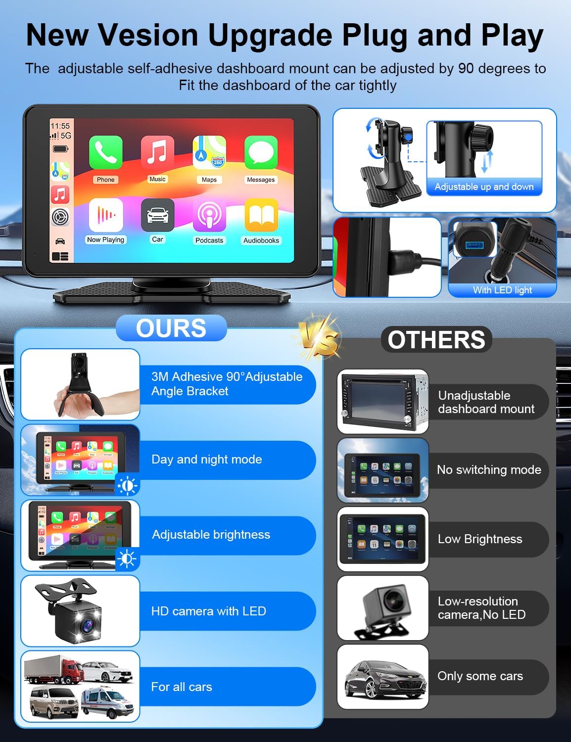 ✅【Adjustable Adhesive mount, Easy Installation to Any Car】This car play stereo screen is easy to install for all vehicles such as cars, trucks, RVs, pickup trucks and more. You don’t need a professional installer, it only takes 3 min to install, Equipped with an adjustable self-adhesive dashboard mount, simply mount 7 inch Android Auto Car Stereo to your dashboard with 90° adjustable, it can be firmly attached to your car and easily removed as your needs, You can keep the car’s original radio and they both can coexist perfectly