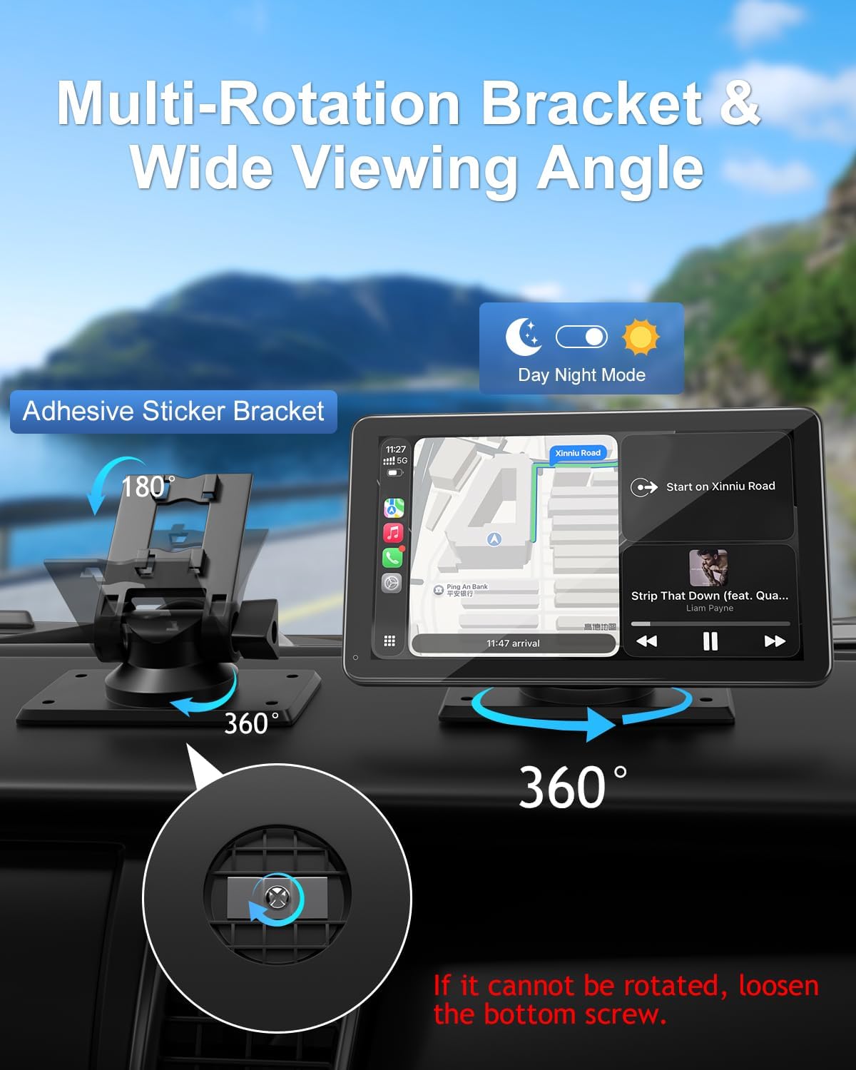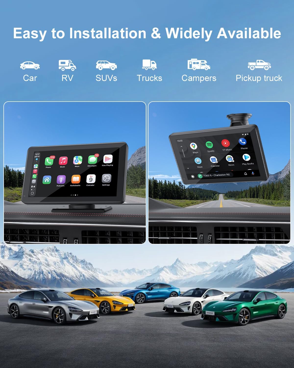 【Rock-Solid Mount & Easy Installation】No more shaking on bumpy roads. Our upgraded mount features a three-layer nano gel base that creates a powerful vacuum seal—holds your carplay screen firmly to windshields or dashboards. Installation takes minutes: plug into your cigarette lighter (works with 12V-24V vehicles) and mount the bracket. Keep your factory radio intact. Compatible with cars, trucks, SUVs, vans, trailers, and campers.