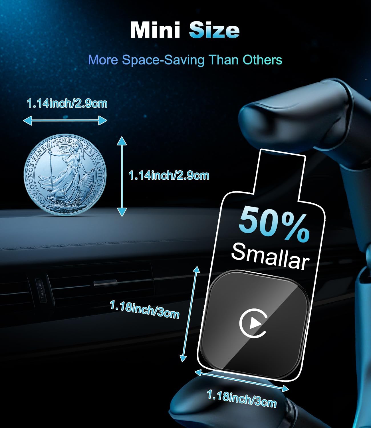 [Ultra Mini Design, Clear Up Your Car Space] Featuring an ultra-compact profile that’s roughly 50% smaller than standard adapters, this lightweight yet sturdy wireless CarPlay adapter uses upgraded nano-composite materials. It fits discreetly into any car interior and ensures a seamless smart connection every time.