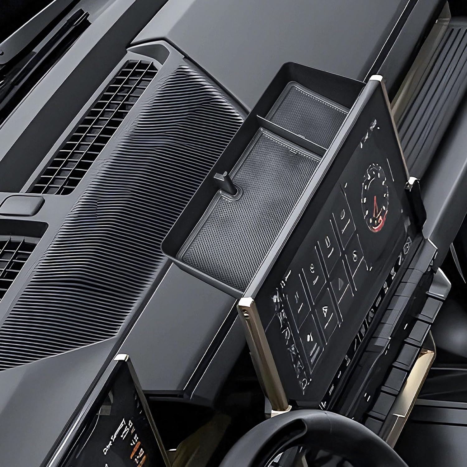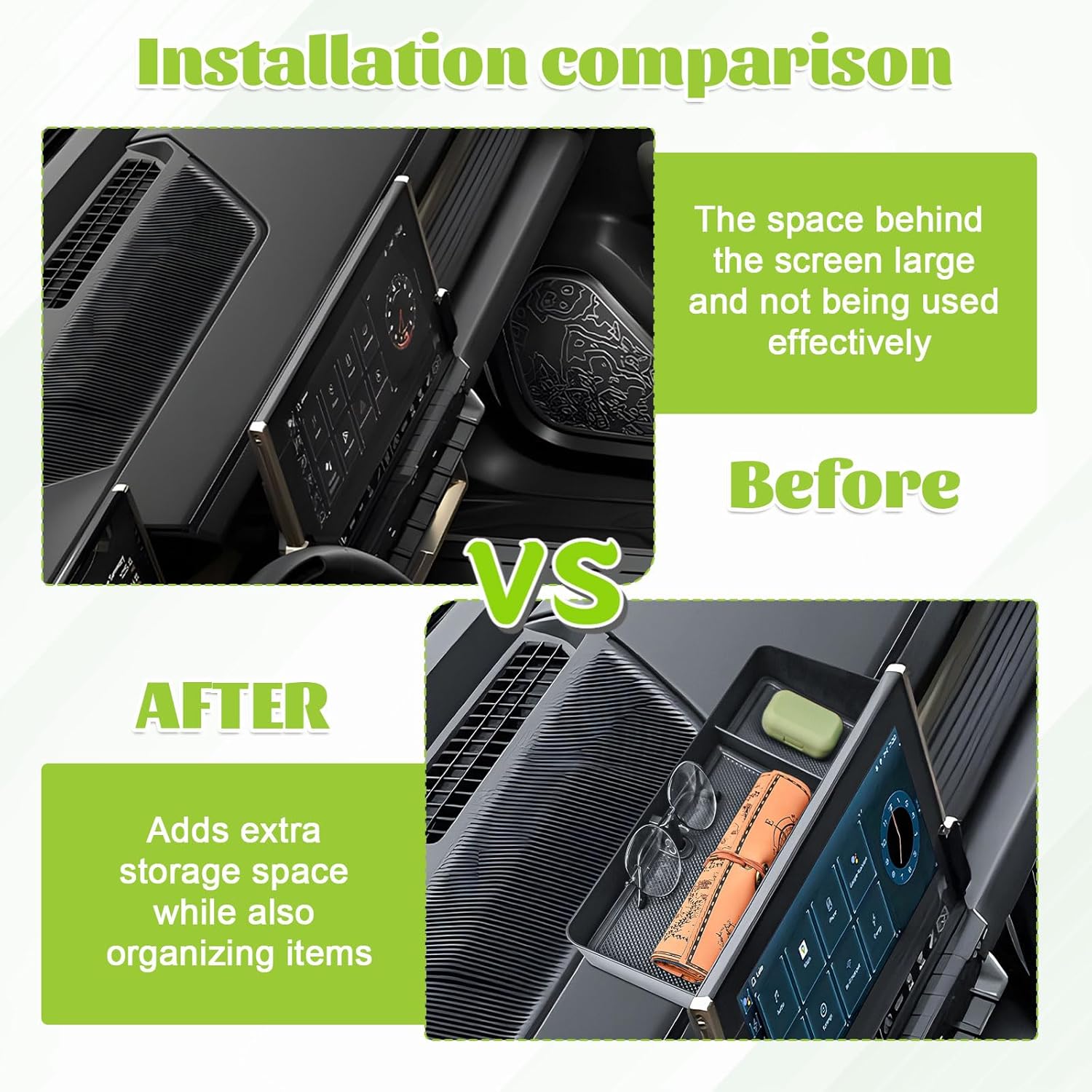 Fits like a glove: The dashboard tray molds snugly to the contours of your dash, adding storage space behind the screen without compromising functionality or style.