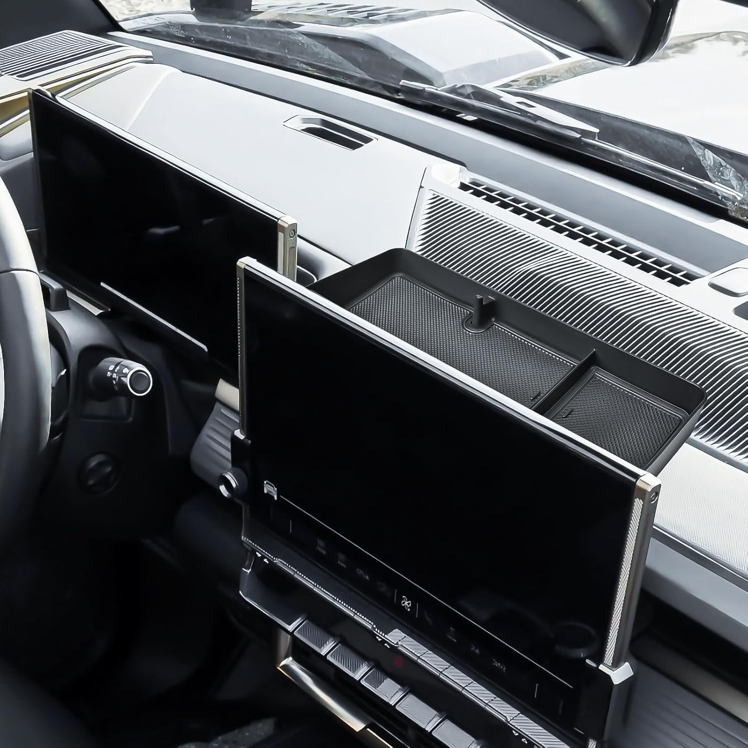 I have a 2025 Tiguan and I’ve been looking for all sorts of tricks to add storage space as it is a smaller cabin and lacks storage. This is listed for a Hummer, but it had similar measurements to my infotainment system so I figured I’d try it.I’m so happy I did. It fits PERFECTLY behind my 15” screen. I recommend measuring the screen to make sure it’s close and looking behind your screen before ordering, but if you think it’s going to fit, it’s a fantastic edition. I can guarantee a good fit for the 2025 Tiguan SEL R-line with the large 15” screen.The one thing I did to ensure it would be stable is added a piece of double-sided tape on the bottom near the front as the back of the tray where the double sided tape is located is not in contact with my dashboard on the Tiguan. But after attaching it, I don’t even think I needed to add extra tape. The included tape on the front sticks to the back of your screen and feels like it would have been strong enough on its own. However, if you like the extra security I recommend a good 2 sided tape.The installation was very simple and the rubber mats hold items in place securely. I strongly recommend this to anyone looking to add a little extra storage.