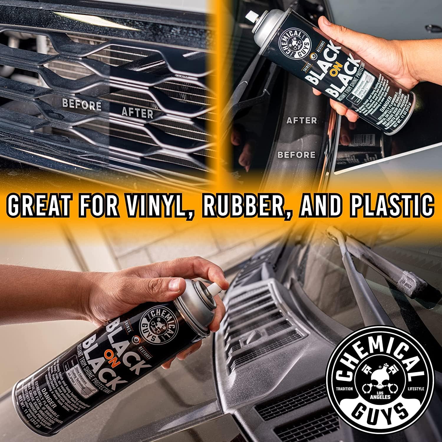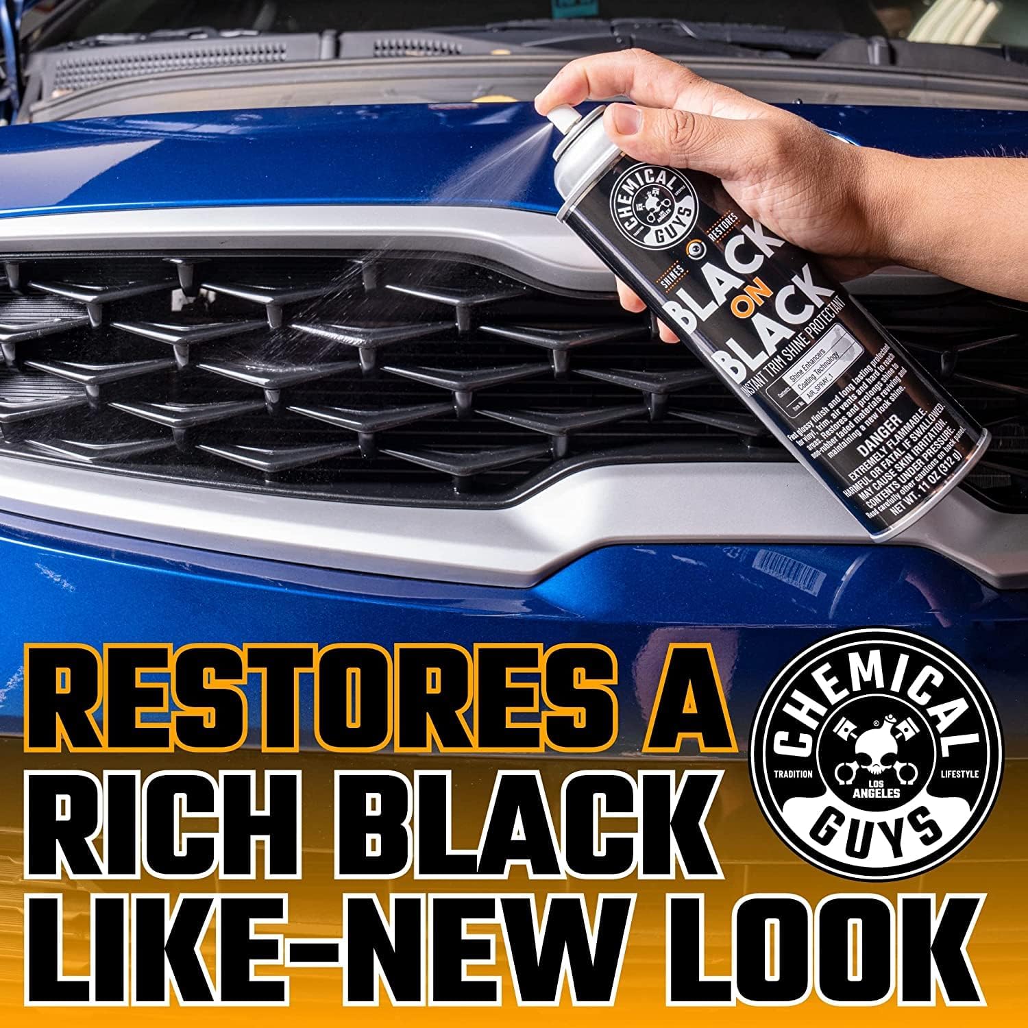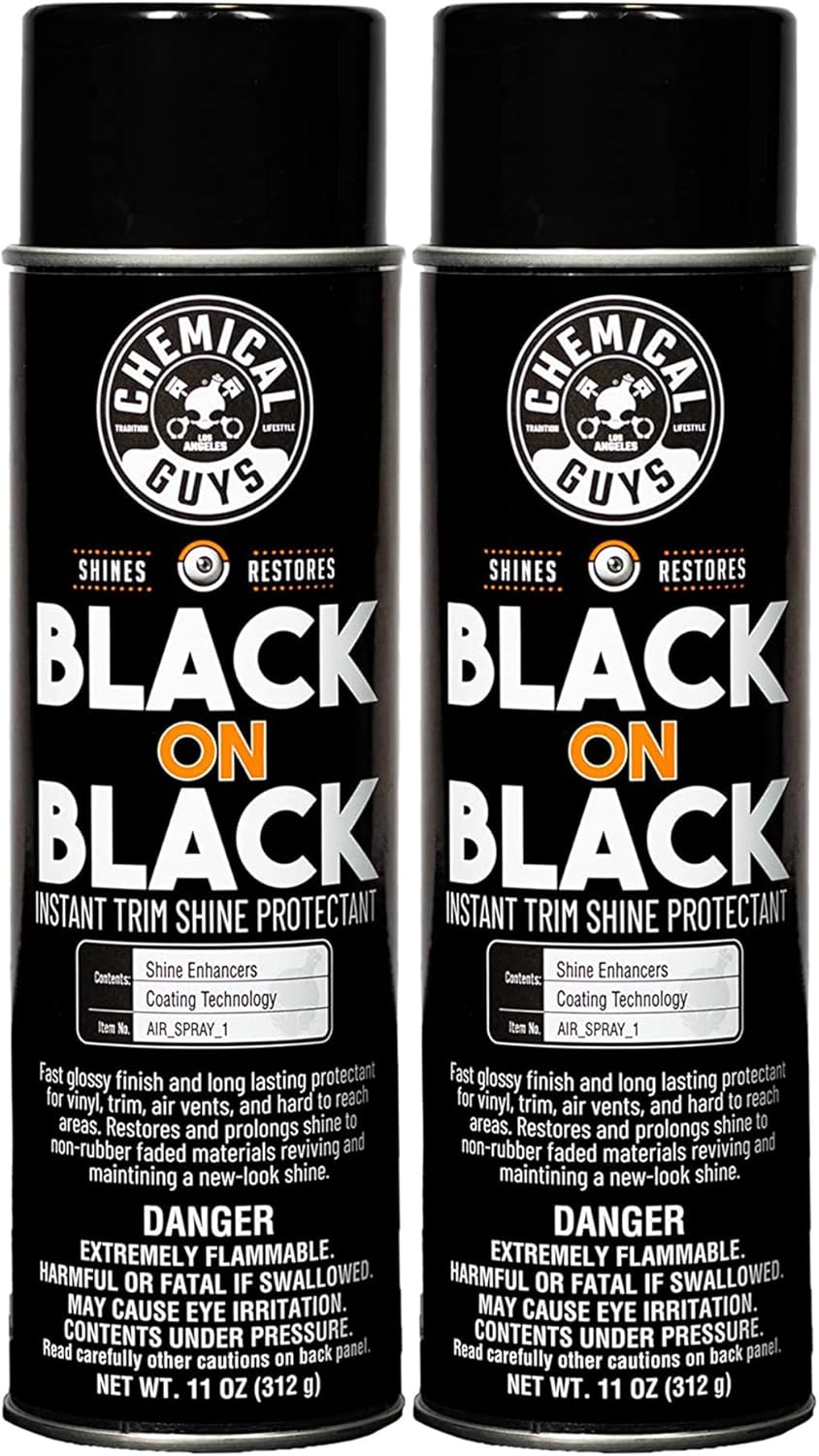Chemical Guys Black On Black Trim Shine (2 Pack, 11 oz each) restores rich black gloss to trim, tires, and rubber. Dry-to-the-touch finish with easy-to-use precision mist spray.