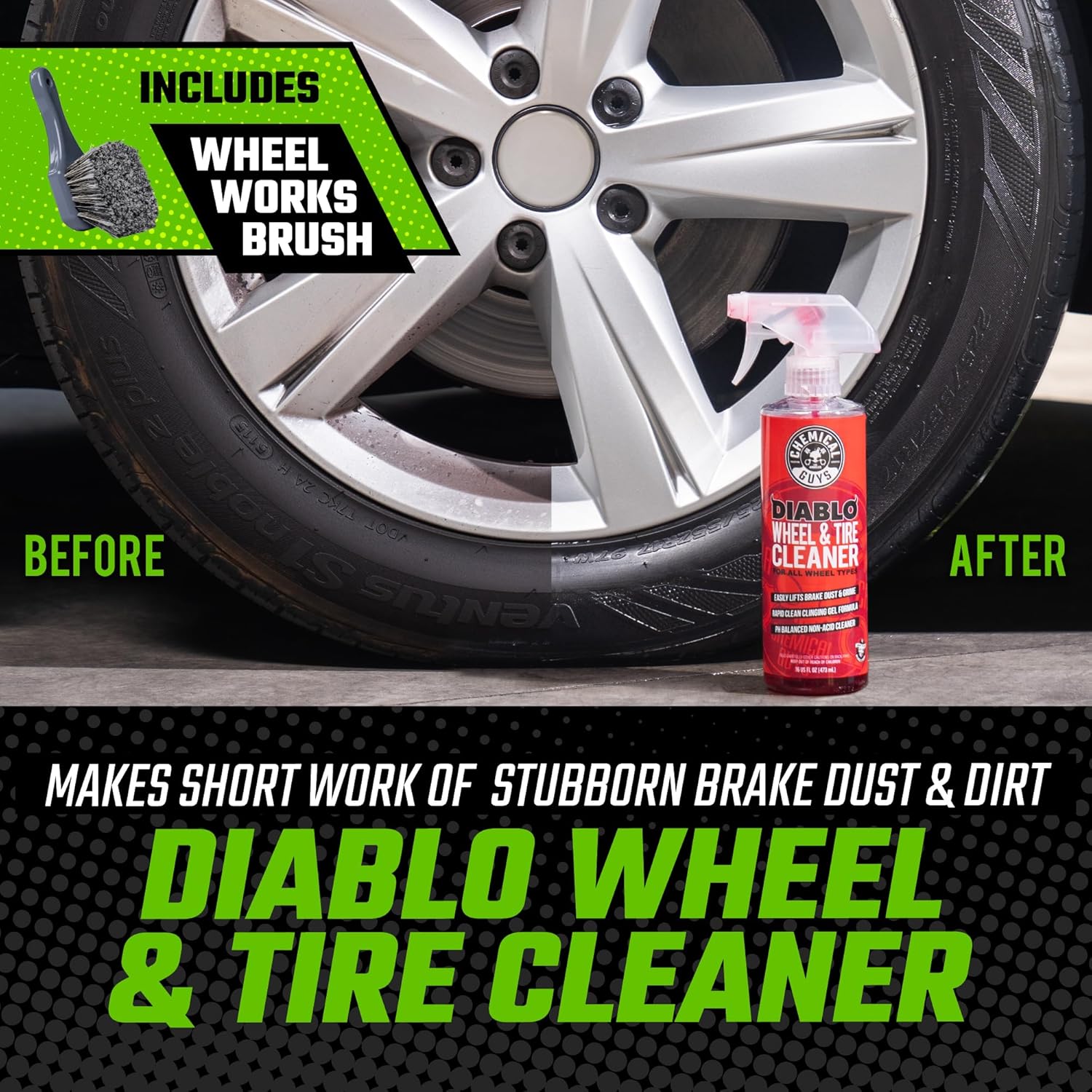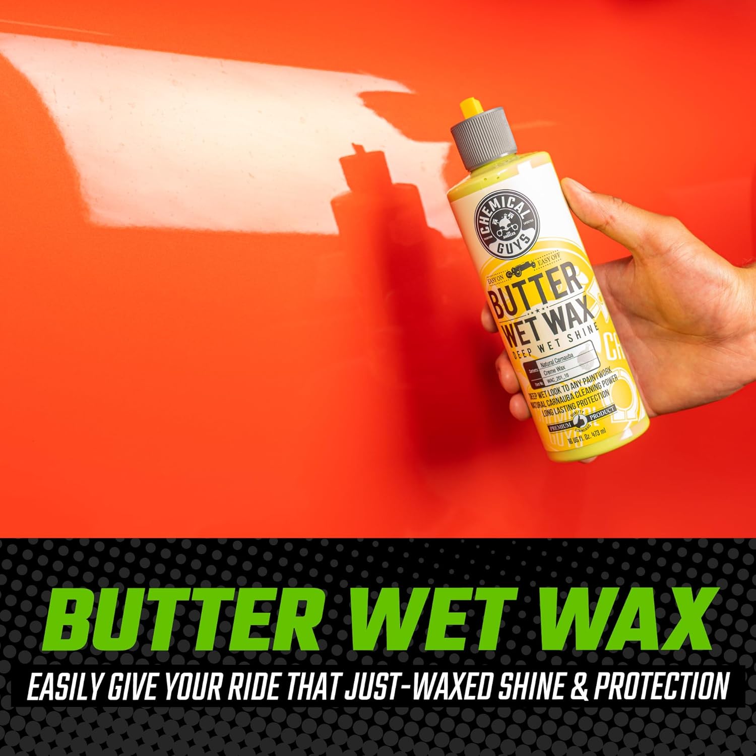 PREMIUM CLEANERS & WAX – This Chemical Guys kit includes Honeydew Snow Foam car wash soap, Diablo Wheel Cleaner, Silk Shine Dressing, Butter Wet Wax, and Signature Glass Cleaner for complete interior and exterior detailing