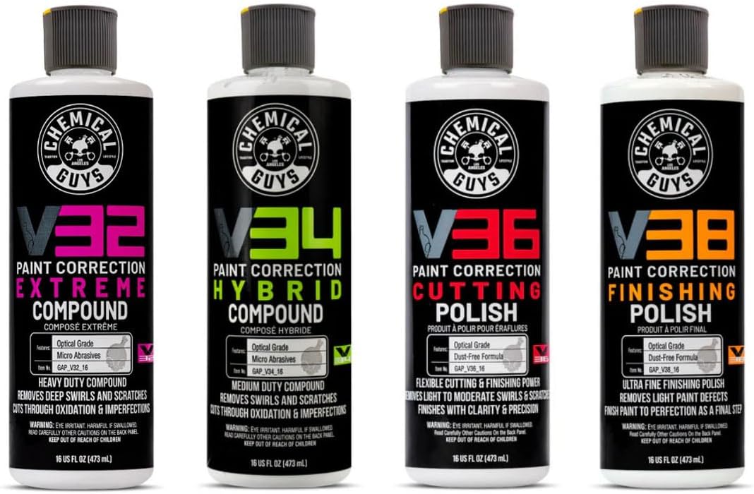 HEAVY TO LIGHT CORRECTION – This Chemical Guys polishing kit includes V32 and V34 car polishing compounds for removing deep scratches, heavy oxidation, and swirls, plus V36 and V38 polishes for refining gloss and depth