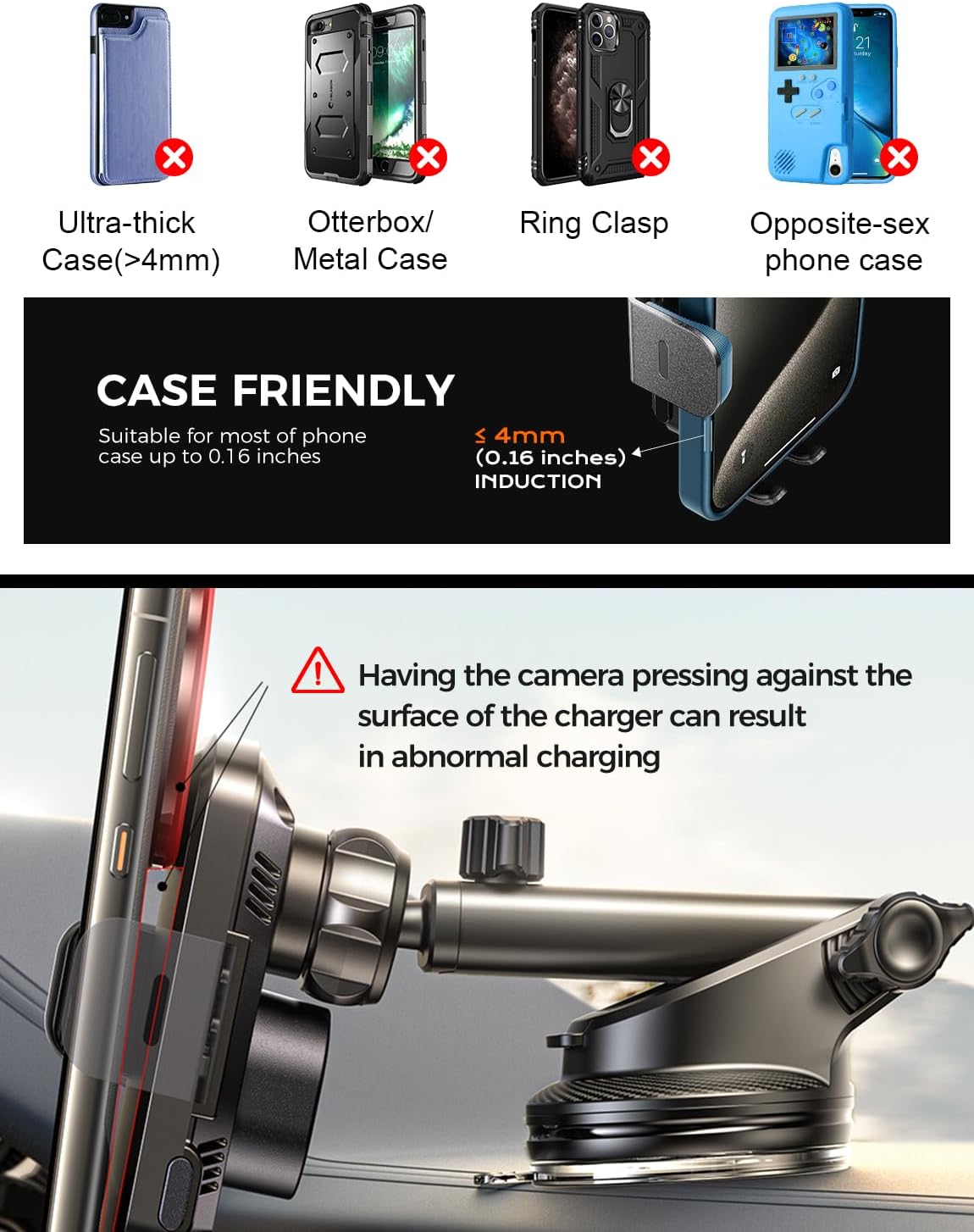 REVOLUTIONARY REUSABLE SUPER STRONG SUCTION CUP to 60LB: Car Phone Mount with Wireless Charging – With upgraded super-strong suction and a super-sticky gel pad, it firmly attaches to the dashboard, windshield, and other flat surfaces. Retains strong suction even in high and low temperatures. Maintenance is a breeze – rinse with warm water and air dry to restore the suction cups. Upgrade your driving experience with this car must haves reliable and versatile car phone mount