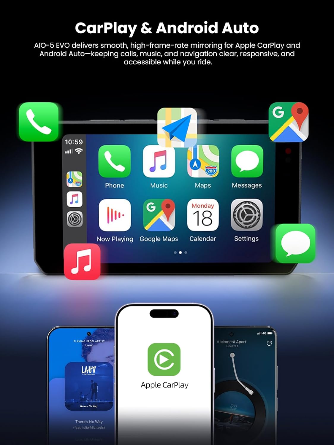 WIRELESS CARPLAY & ANDROID AUTO INTEGRATION – Transform your motorcycle cockpit into a smart command center. The AIO-5 EVO wirelessly mirrors your iPhone or Android device via Bluetooth and Wi-Fi, granting you immediate access to navigation apps, music playlists, and calls directly on the unit without exposing your phone to the elements.