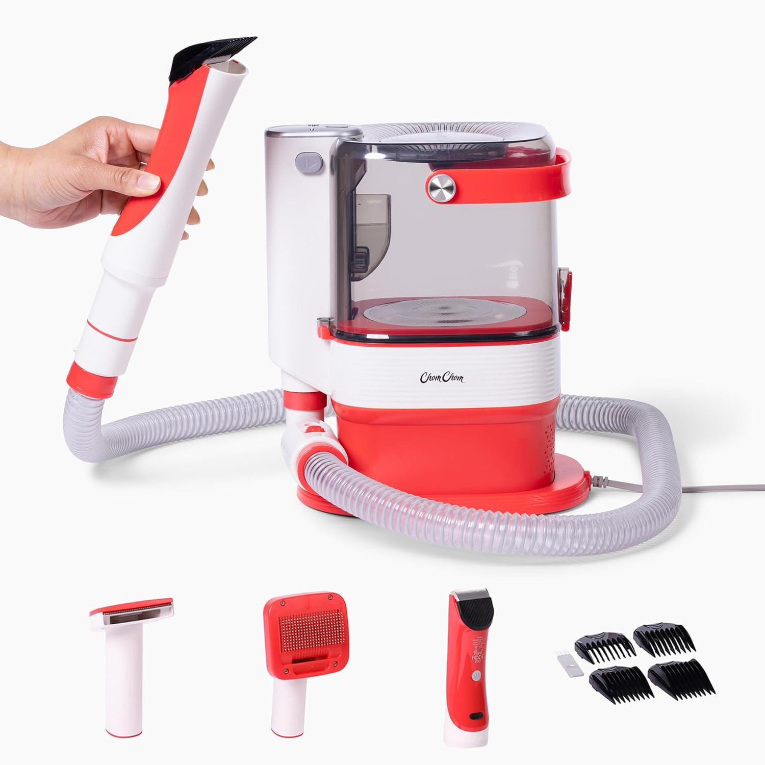 Meet the ChomChom Grooming Vacuum — the all-in-one dog hair grooming vacuum kit that elevates pet care beyond a traditional lint roller. This versatile tool combines grooming and vacuuming, capturing fur directly into a large-capacity collection bin for a cleaner home with less cleanup. With up to 13000Pa suction, it efficiently collects up to 99% of pet hair, making it a standout dog grooming vacuum clippers solution that minimizes mess in every grooming session. Designed for versatility, this 7-in-1 style dog grooming kit with vacuum includes three core attachments: a precise trimming head with extra guard options for safe, controlled trimming; a grooming nozzle for thorough fur removal across coats; and a fine-fiber extraction tool to tackle shedding on furniture, carpets, and car interiors. Whether you’re deshedding, detangling, trimming, or vacuuming, this dog grooming kit with vacuum handles hair from dogs and cats, delivering practical, home-friendly care. Low-noise operation and multiple suction levels ensure pets stay calm during grooming, while the ergonomic grip and lightweight design make it easy to maneuver around couches, chairs, and stairs. All components neatly nest in the included storage bag for tidy storage between uses, with a large bin that reduces downtime when collecting pet hair. Key benefits you’ll love: Powerful 13000Pa suction for near-total fur capture into the vacuum container, ideal for dog hair on floors, furniture, and car interiors. All-in-one dog grooming vacuum kit with three attachments (trim head with guards, grooming nozzle, fine-fiber extraction tool) for comprehensive coat care, deshedding, and shedding control. Large capacity collection bin reduces empties, speeding up grooming sessions. Low-noise operation with adjustable suction levels to keep dogs and cats calm during grooming; suitable for puppies and adult pets.