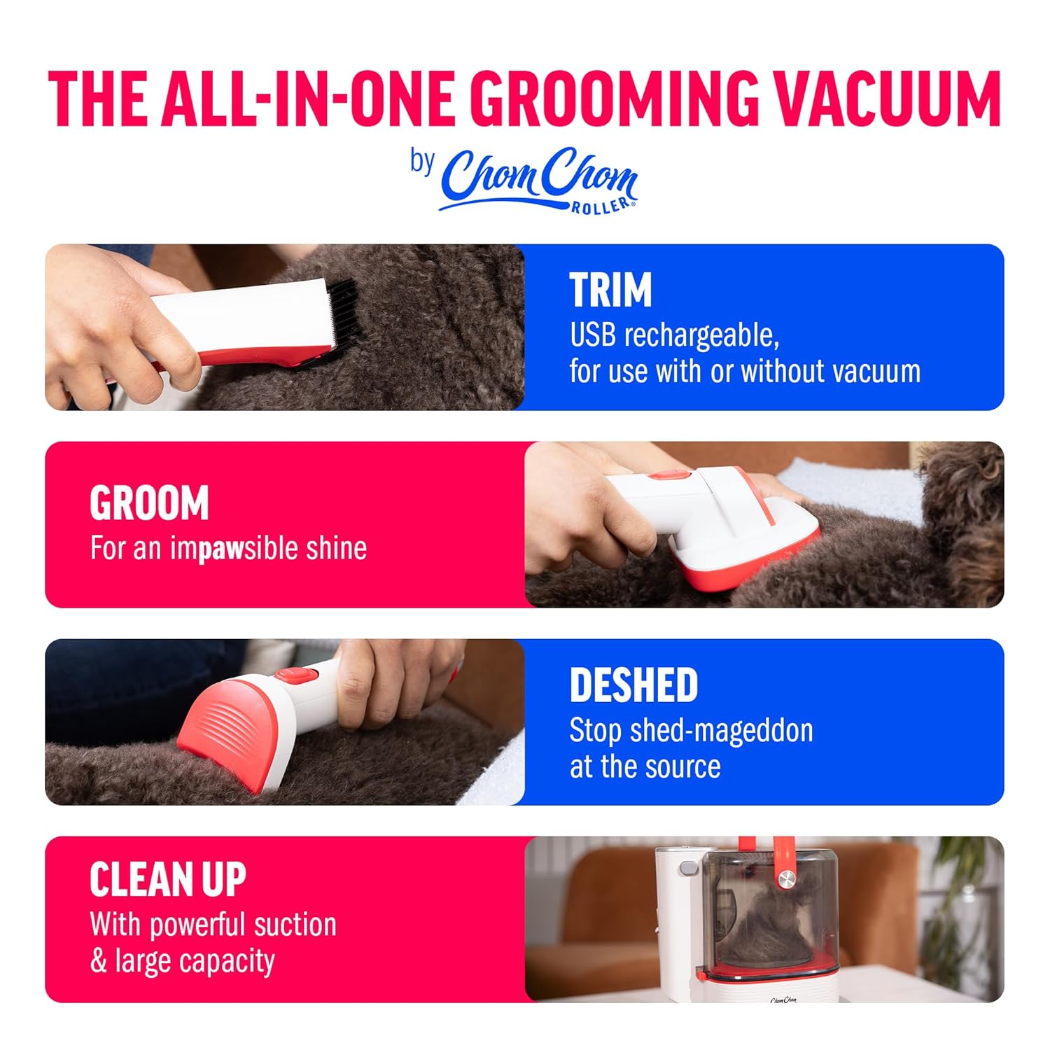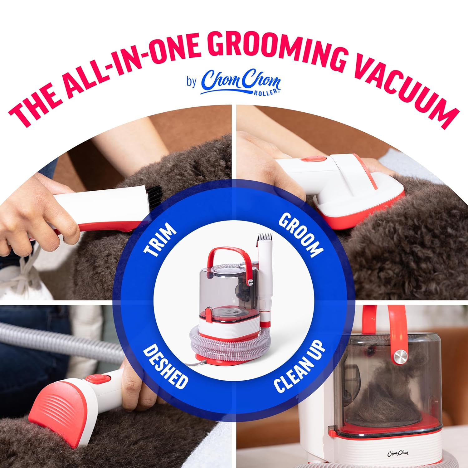 ChomChom Roller Dog Vacuum for Shedding Grooming – Dog Grooming Kit with Dog Brush Vacuum Attachment, Pet Hair Clipper with Guards, Large-Capacity Bin