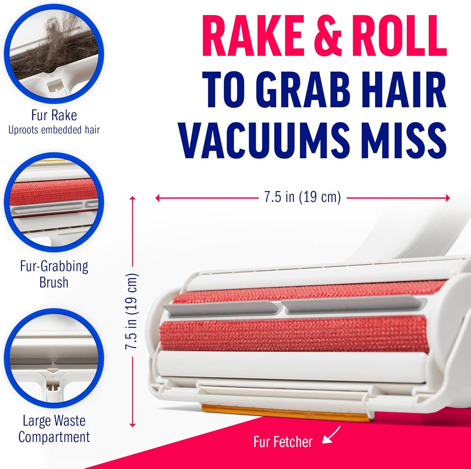 MADE FOR REAL LIFE MESS: Effortlessly remove pet hair from couches, pillows, carpets, car seats, and pet beds. The built-in rake helps loosen stubborn hair, while the rolling motion captures it—no vacuum required.
