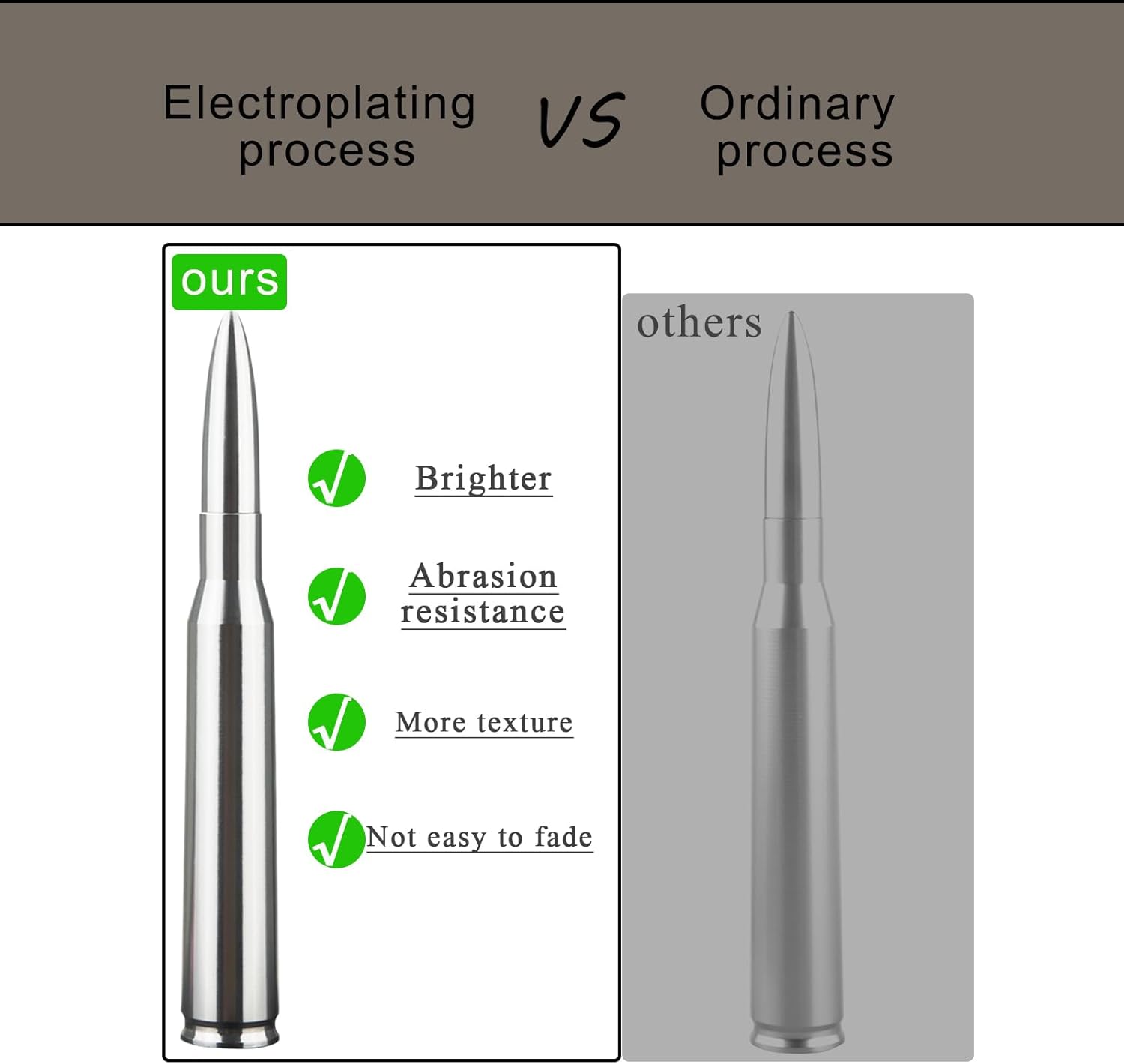 This chorme bullet antenna is shiny and very cool. It is a good car decoration, and it is also a good choice for gifts.