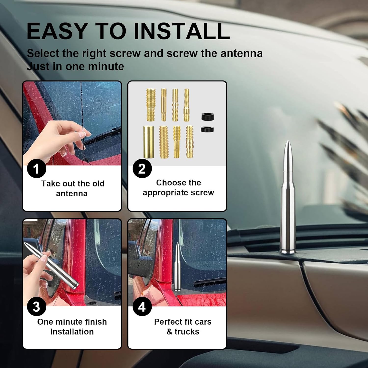 This bullet antenna is very simple to install. No tools are required. It is fit for most trucks,cars or SUV.