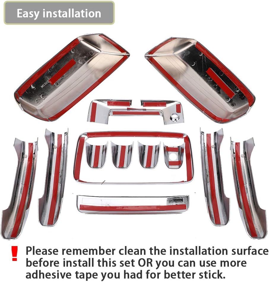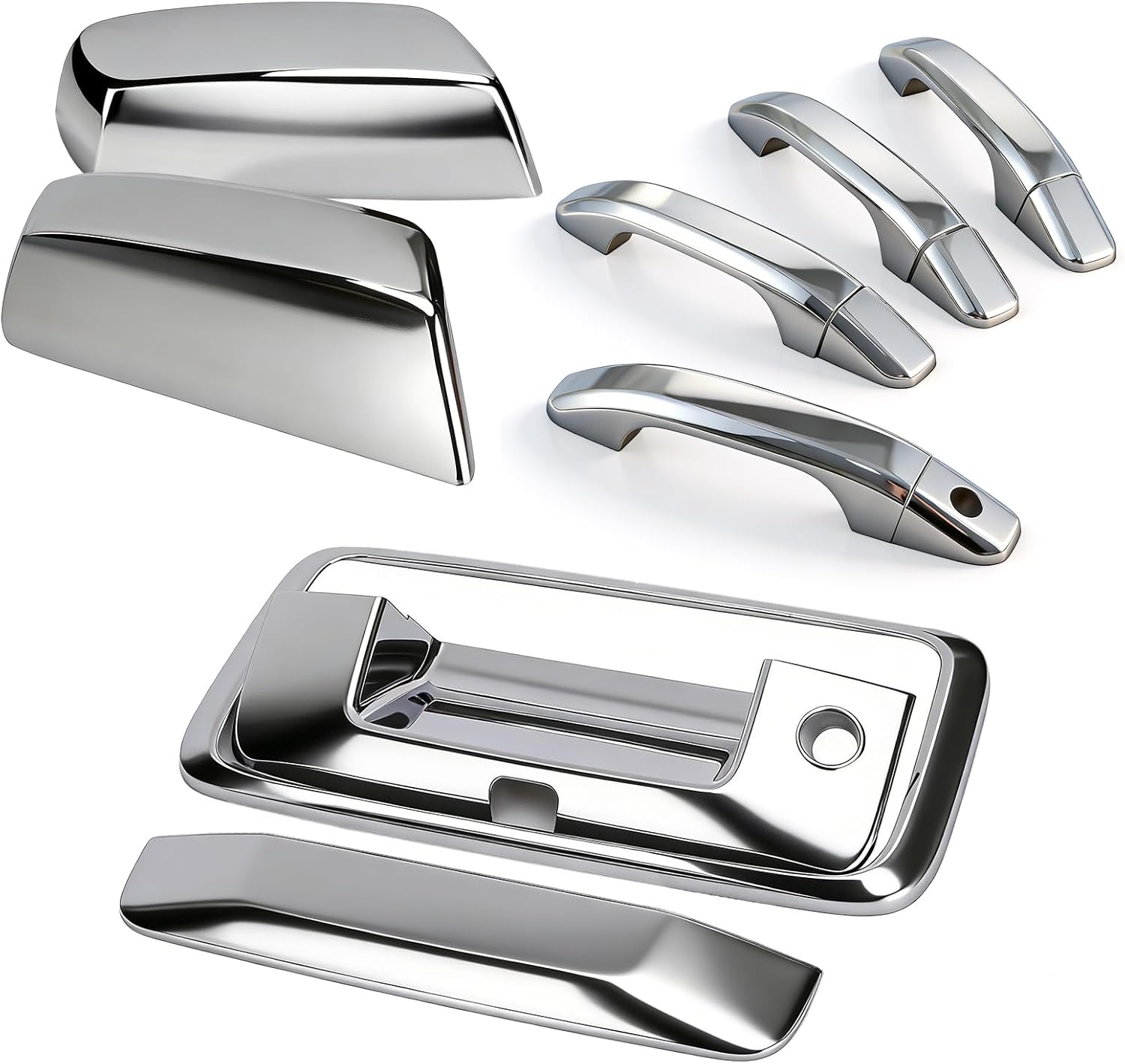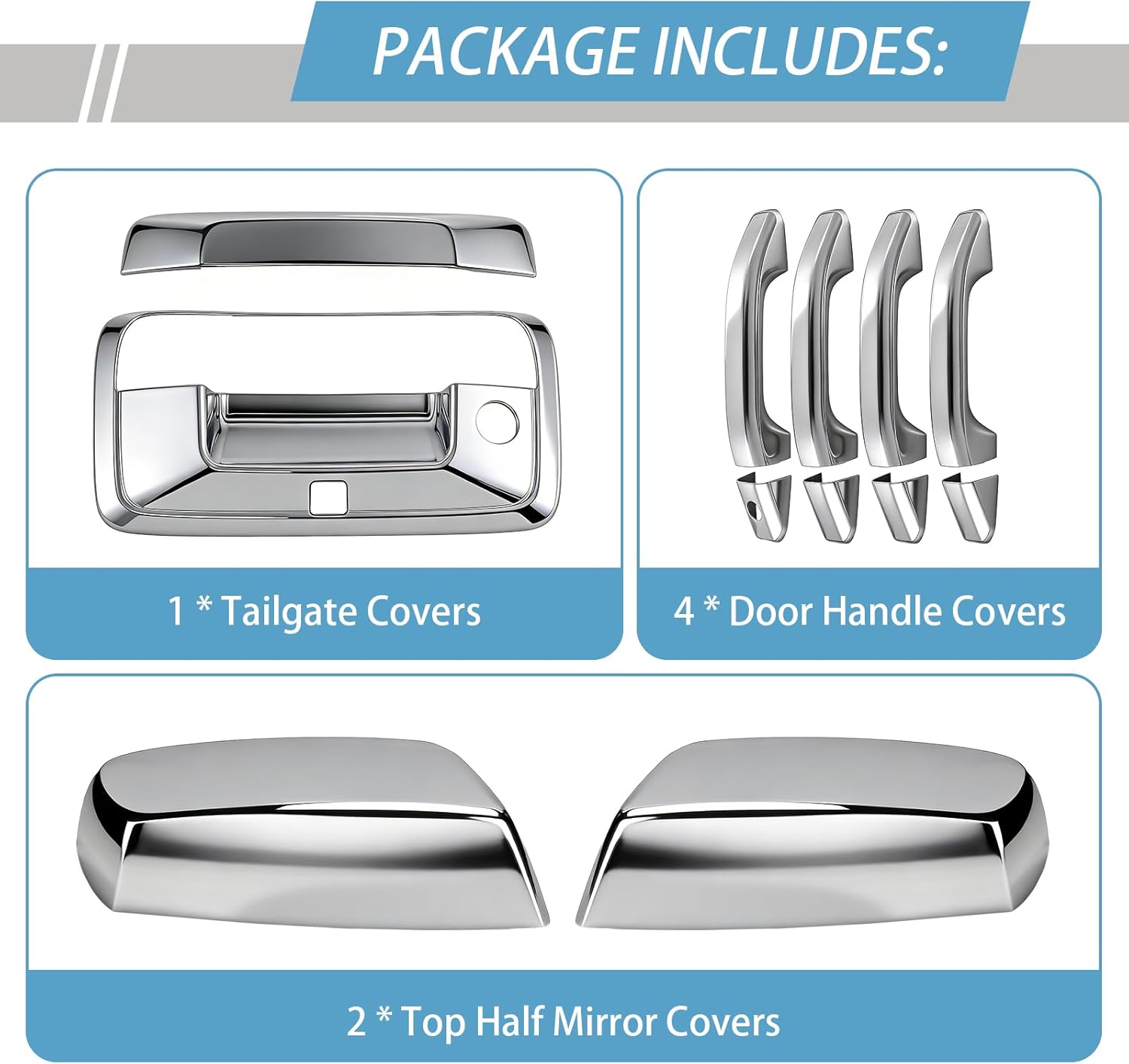 Package Contents: Includes – 4 chrome door handle covers, 2 chrome mirror covers (not for tow mirrors), and 1 chrome tailgate handle cover with camera hole
