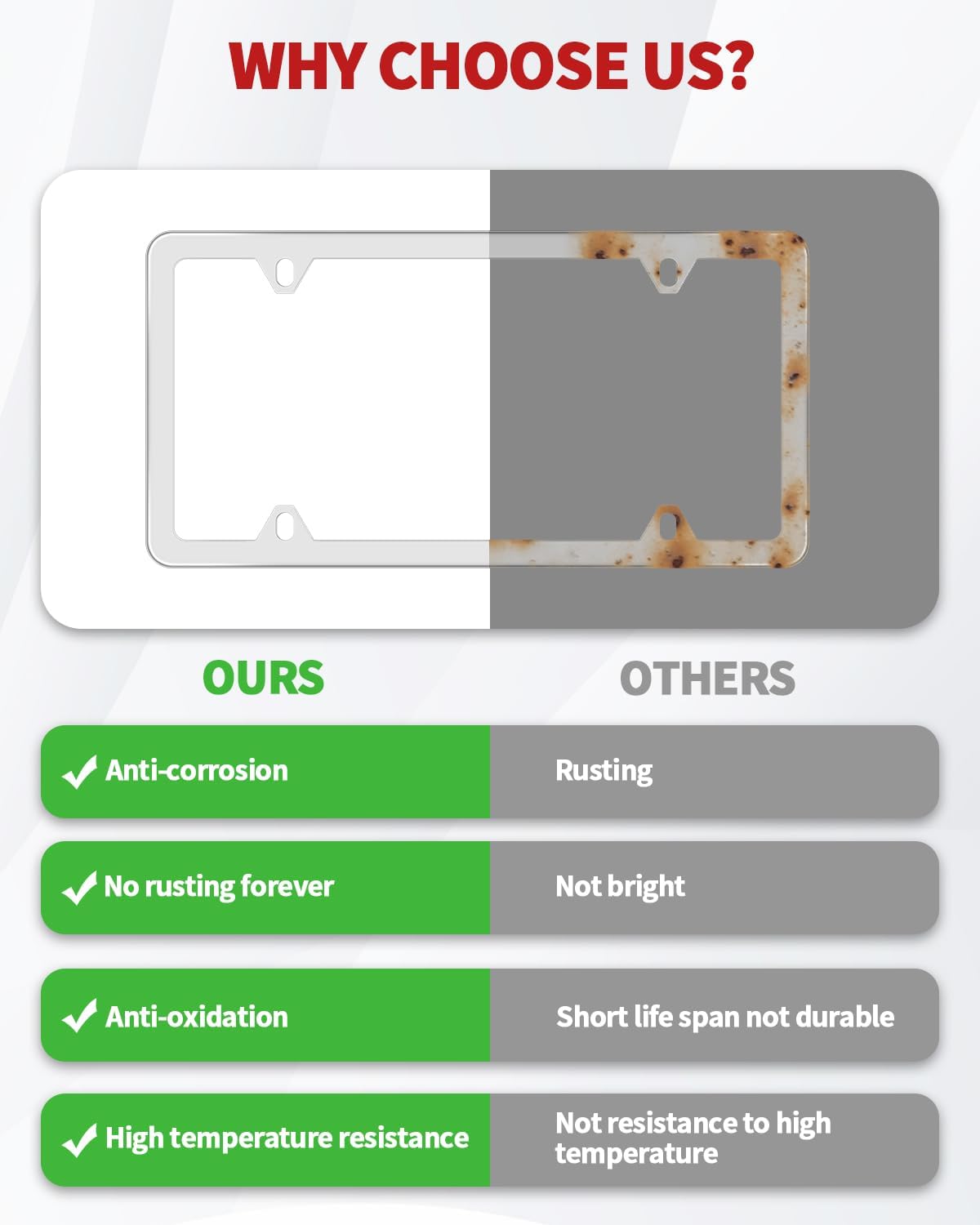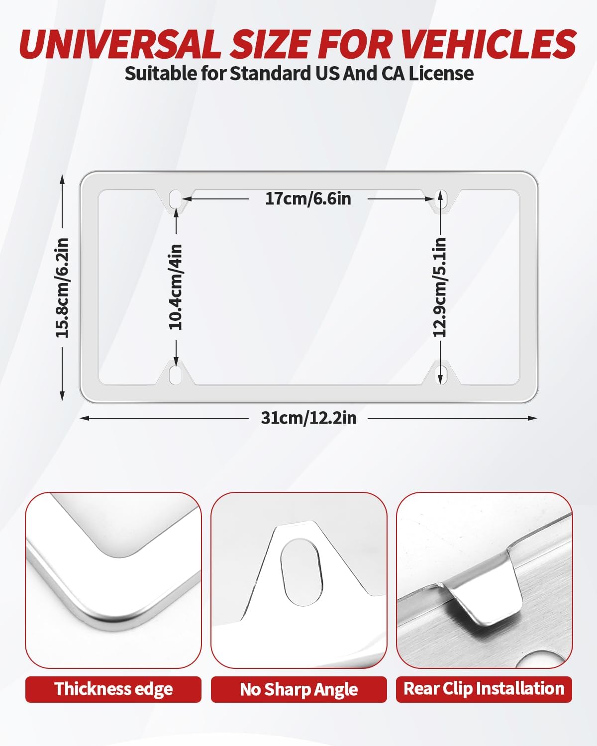 Standard License Plate Size: Our chrome license plate frame made of zinc alloy metal are designed according to the standard size of usa license plate, suitable for all american/canada 12″ x 6″ standard license plate