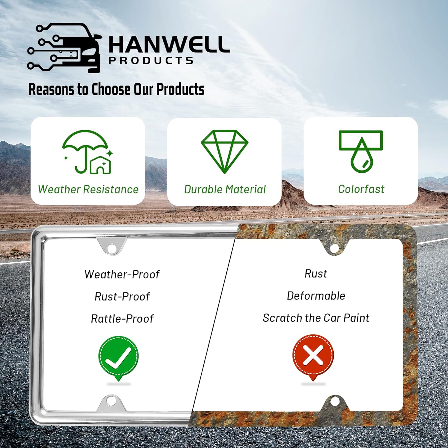 Why Choose Hanwell Products:We are professional license plate frame manufacturers, every license plate frame we manufacture is a handicraft. High quality craftsmanship makes our products more durable and stronger. Any questions please let us know without hesitation at any time, and we are always here to satisfy all of you.