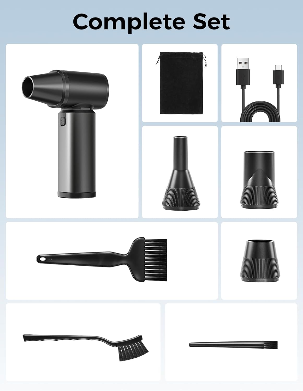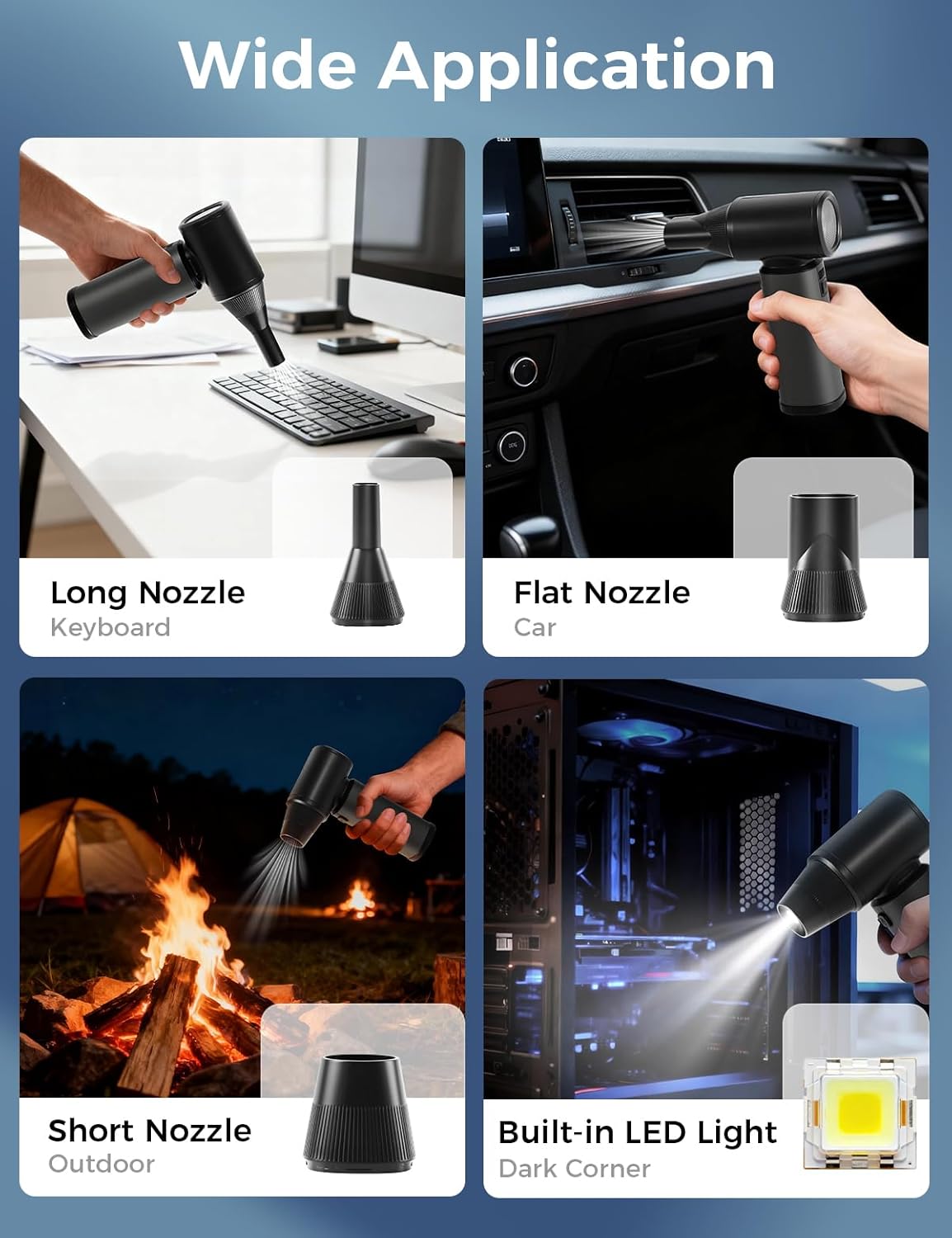 This air duster is way stronger than I expected. It easily blows dust out of keyboards, PCs, and tight spaces, and the adjustable speed is great for switching between gentle cleaning and full power. Battery life is solid, charging is fast with USBC, and the LED light is surprisingly useful for dark corners. It feels well made, lightweight, and the extra nozzles make it versatile for home, car, and even outdoor use. Definitely a great reusable alternative to disposable air cans. Highly recommend!