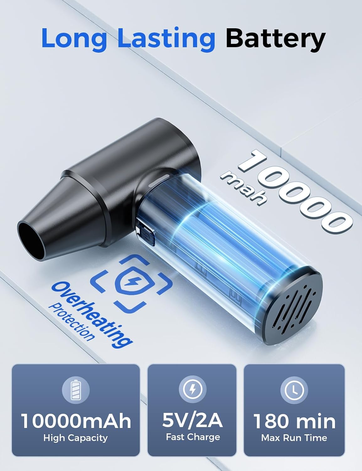 Fast Charging and Extended Battery Life: Equipped with a Type-C fast-charging cable, it fully charges in 3-3.5 hours. The built-in 10000mAh rechargeable battery delivers 15-180 minutes of runtime in stepless speed control mode, varying based on wind speed. The internal battery features overheating protection, current protection, and short-circuit protection to ensure safety throughout the charging process.