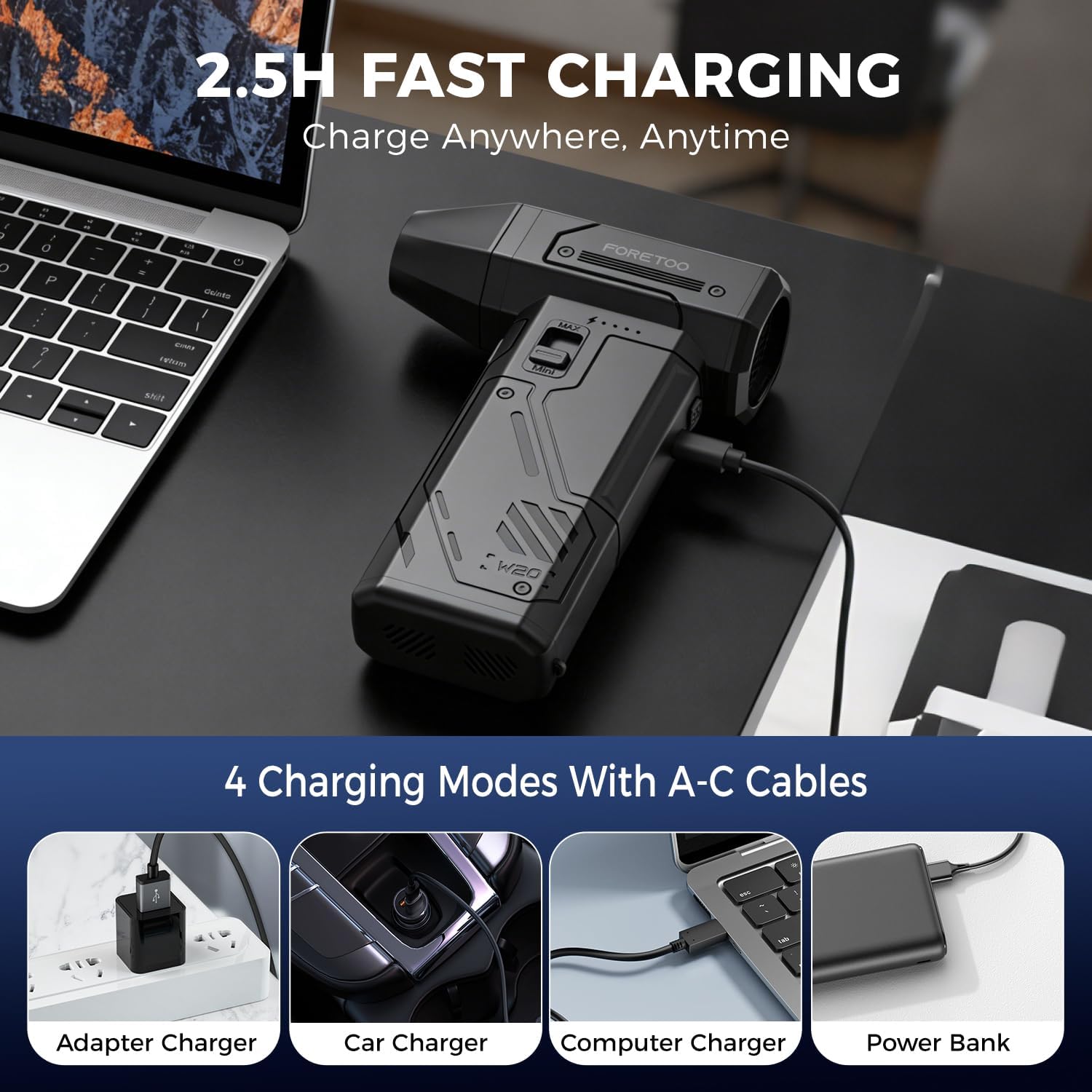 ✅ Extended Runtime with 5200mAh High-Capacity Battery Say goodbye to frequent charging interruptions! Equipped with a 5200mAh large-capacity lithium battery, our dust Duster, At the 1st gear, it blows for up to 350 minutes on a full charge continuous ,At Max gear,it can blows for 23mins.Enough to tackle a full car interior cleaning, workshop tool maintenance, or entire home dusting session without power anxiety . The advanced battery management system ensures stable performance and long cycle life, while the Type-C fast-charging design lets you quickly recharge for next use, perfect for both indoor and outdoor scenarios like camping or road trips.