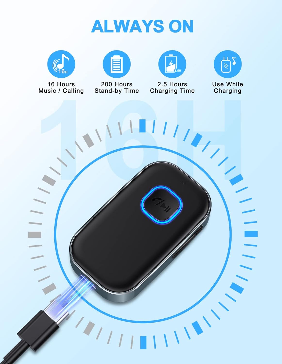 【16 Hours of Long Battery Life】This car Bluetooth adapter lasts up to 16 hours when making calls or playing music. And it can be fully charged in just 2.5 hours using the Type-C fast charging cable (included in the package). In addition, this Bluetooth music adapter can also be used while charging, very convenient.